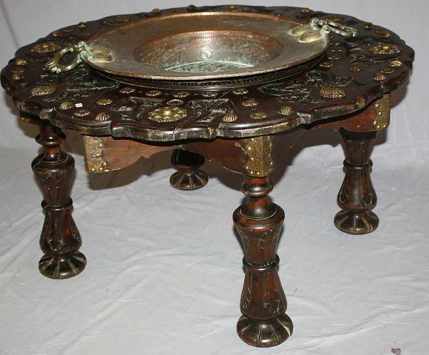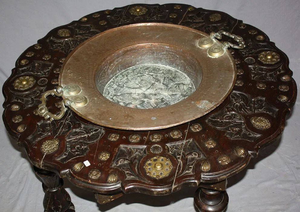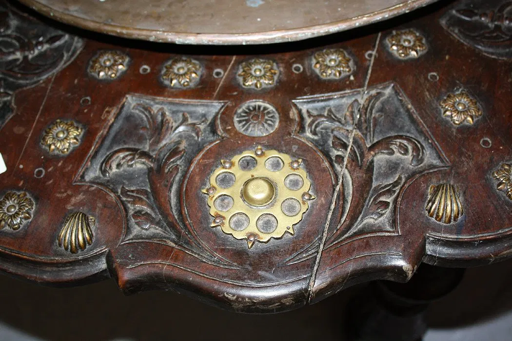 and scallop shells. Relief carvings of armory & brass scallop shells throughout. Scallop shells representing the route of St Jacques de Compostell.21 1/2″h x 37″diam