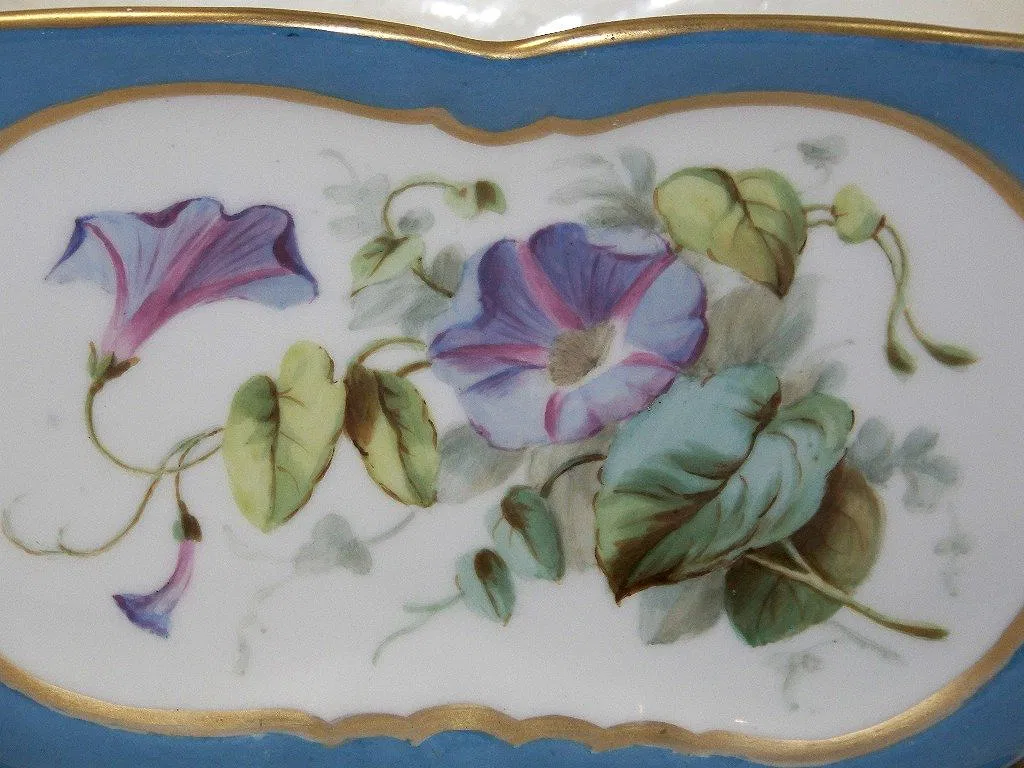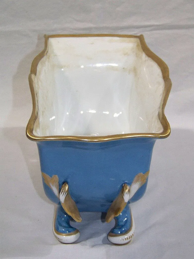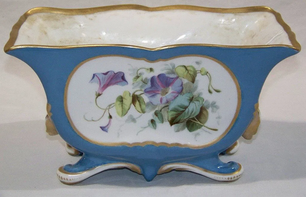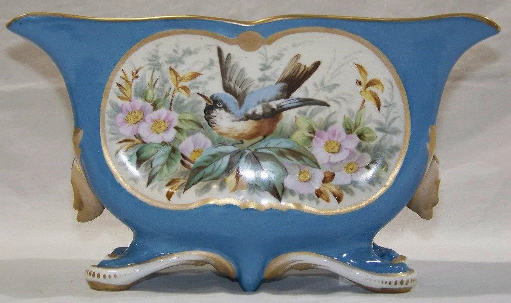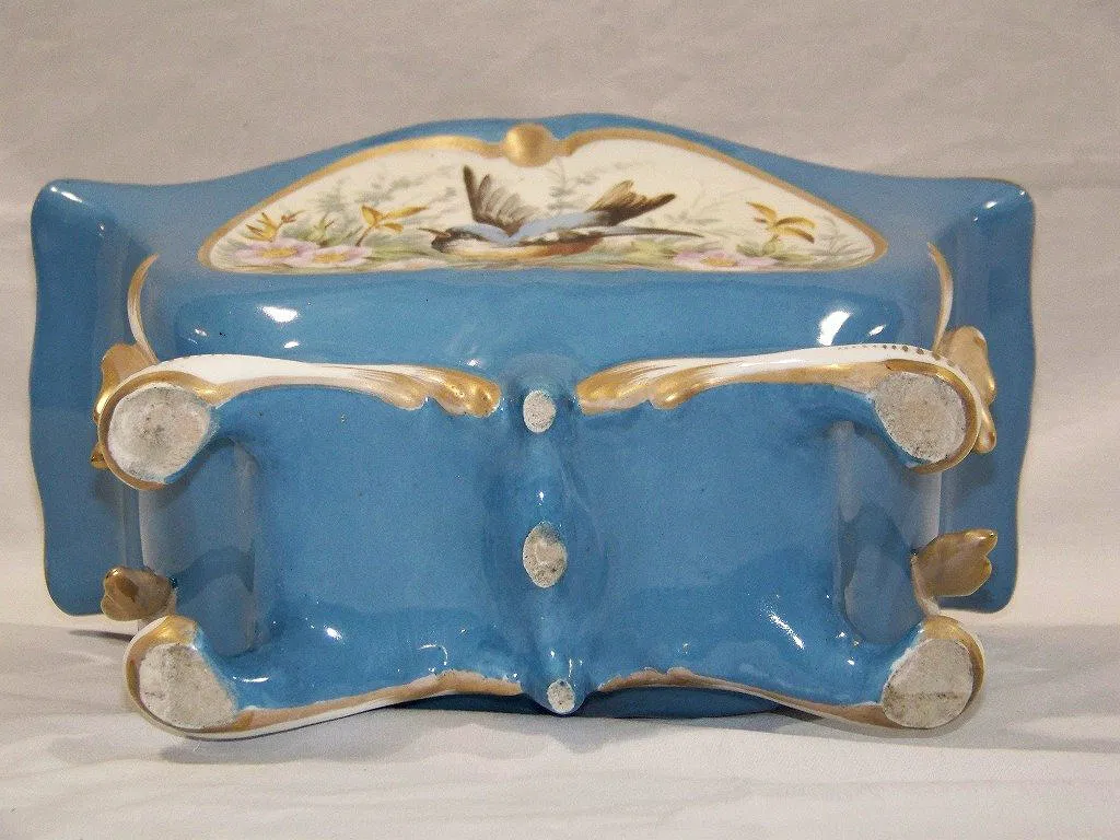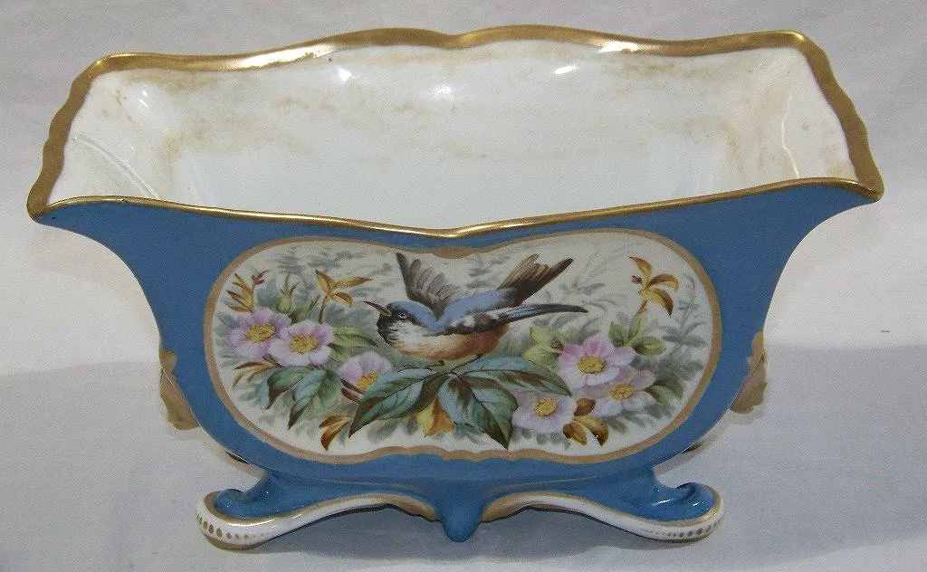 19th C.Old Paris/Sevres Porcelain Hand Painted Planter. Hand painted with Bird & Flower Decorations.Resting on four curved feet and stands app.6 1/4″ tall,10 7/8″ long and 5 3/4″ deep.
