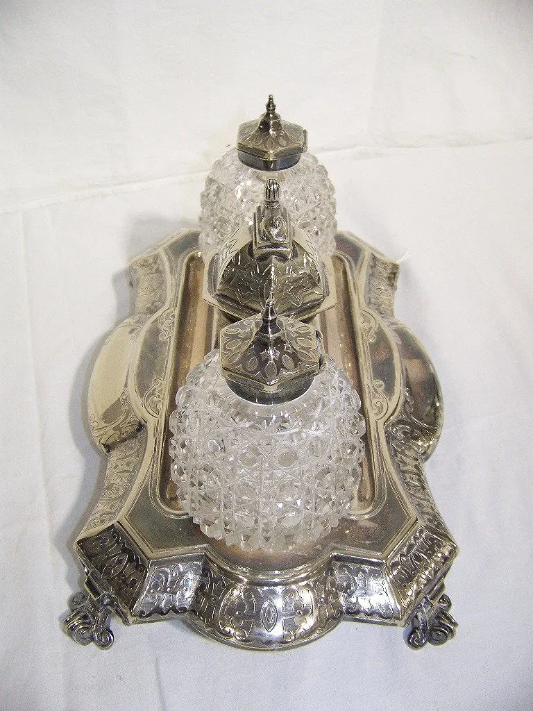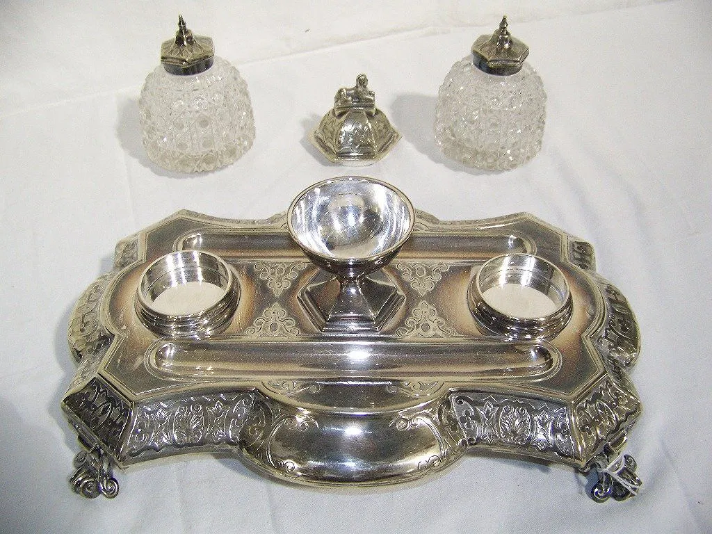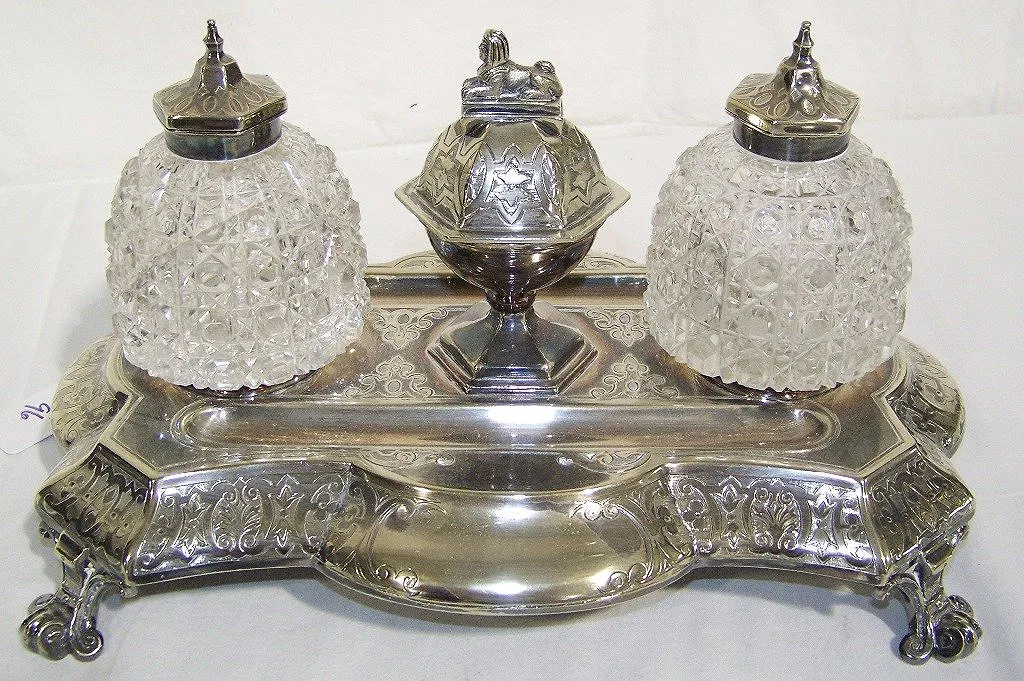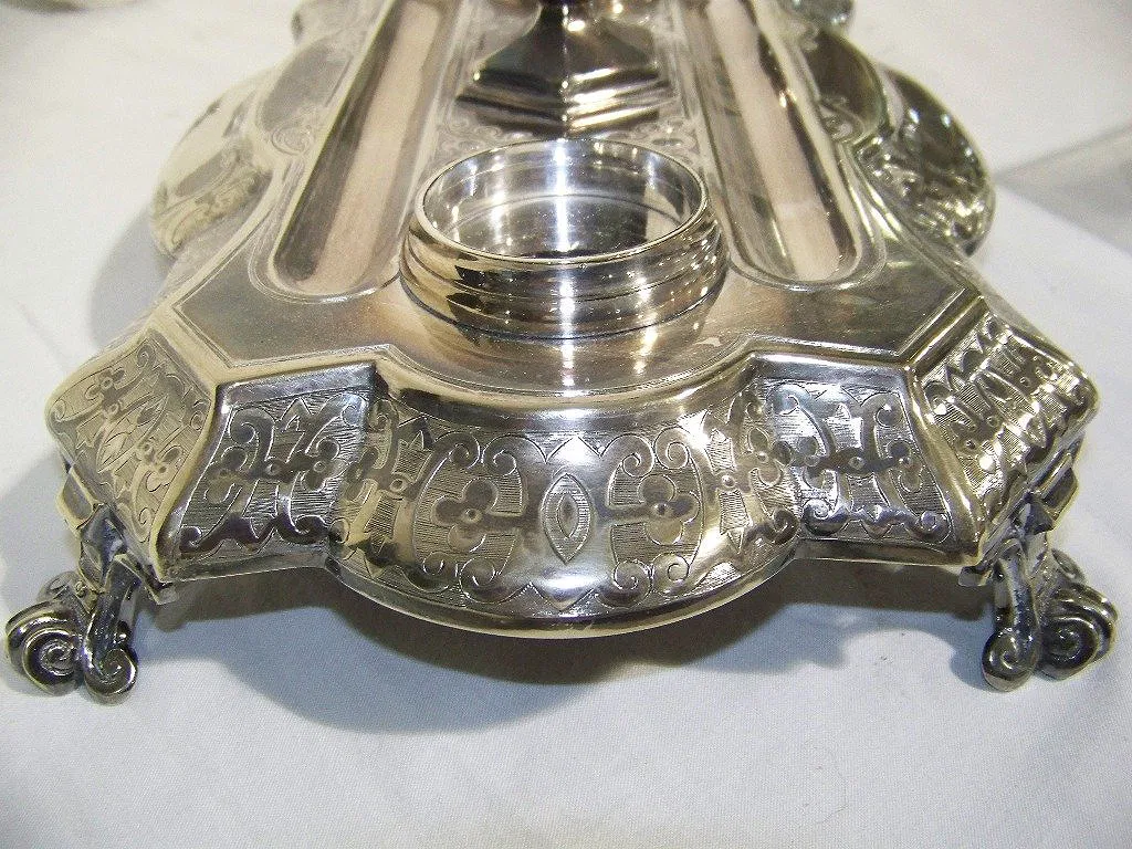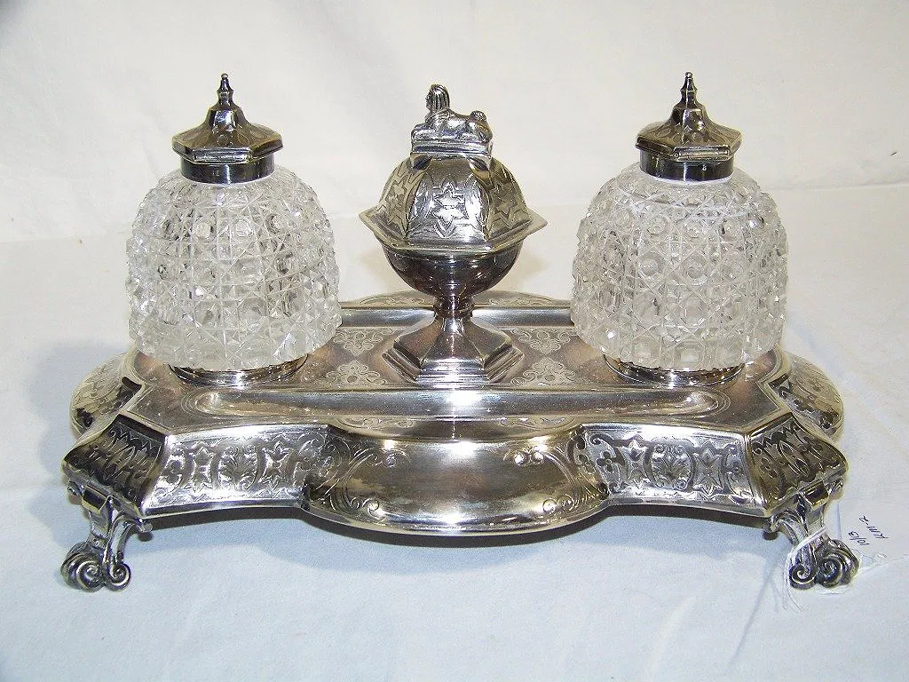 19th C.Ornate Sheffield Encrier, w/ Cut Crystal Inserts with a Sphinx Finial to center pc..Has a pair of very Sharpe cut crystal lidded pcs.( One has a crack in glass as shown)Stands app.7″ tall and 11 1/2″ long and 8″ deep. Hallmarked on base for Martin Hall & Company.