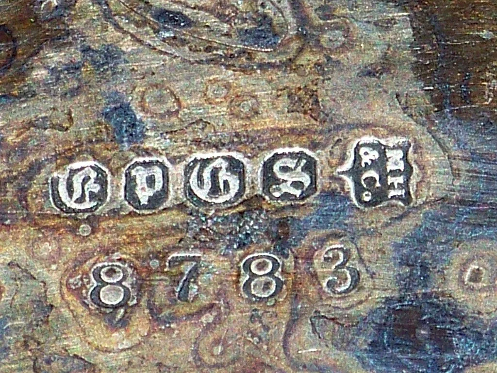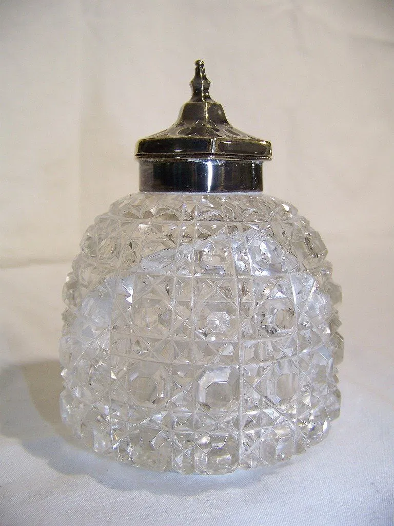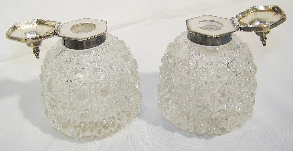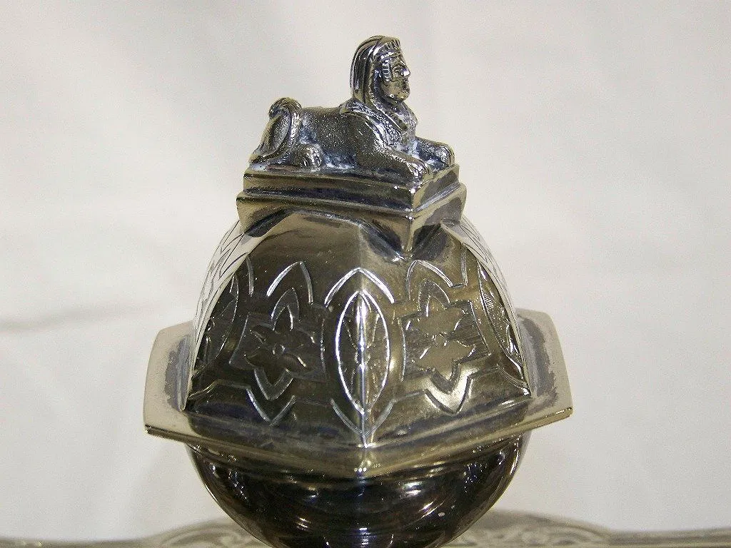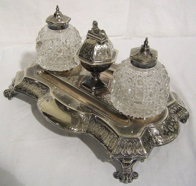 19th C.Ornate Sheffield Encrier, w/ Cut Crystal Inserts with a Sphinx Finial to center pc..Has a pair of very Sharpe cut crystal lidded pcs.( One has a crack in glass as shown)Stands app.7″ tall and 11 1/2″ long and 8″ deep. Hallmarked on base for Martin Hall & Company.