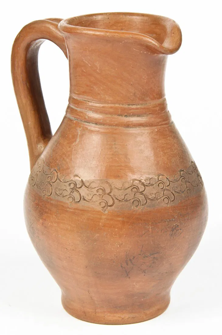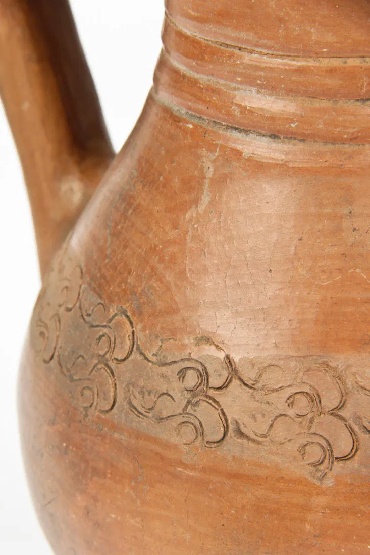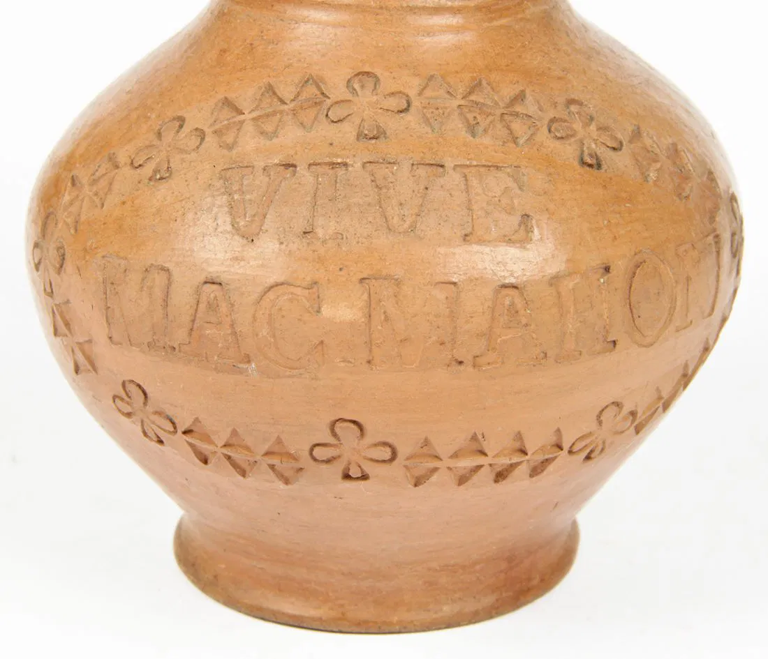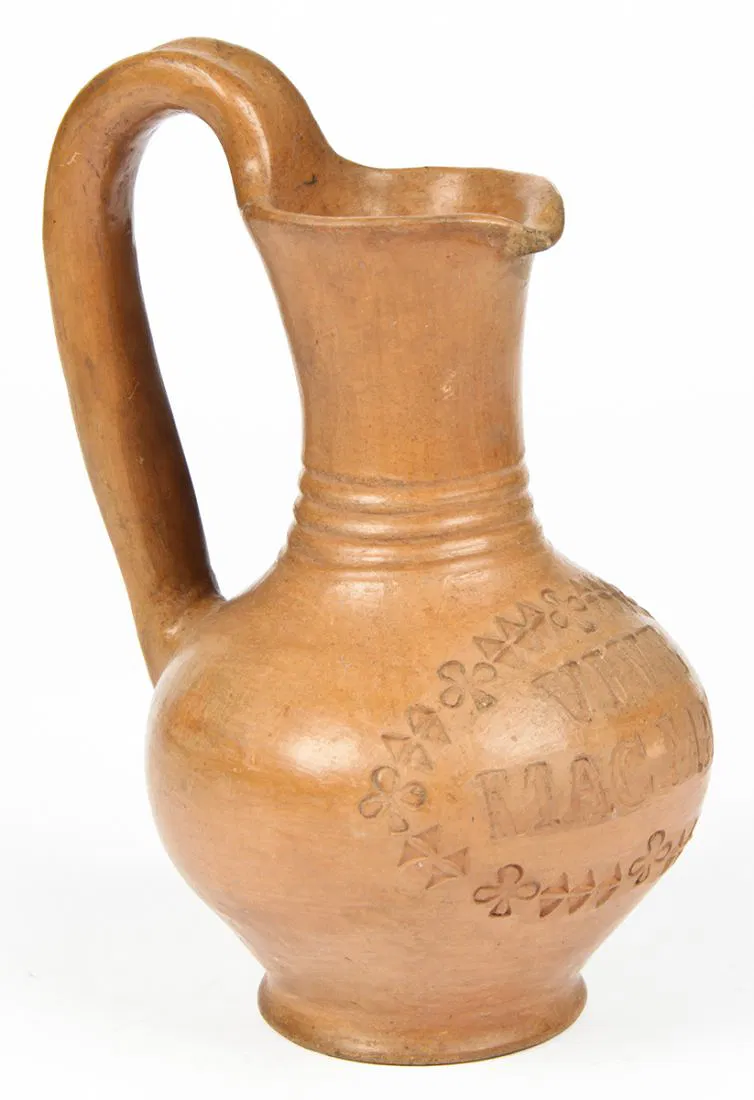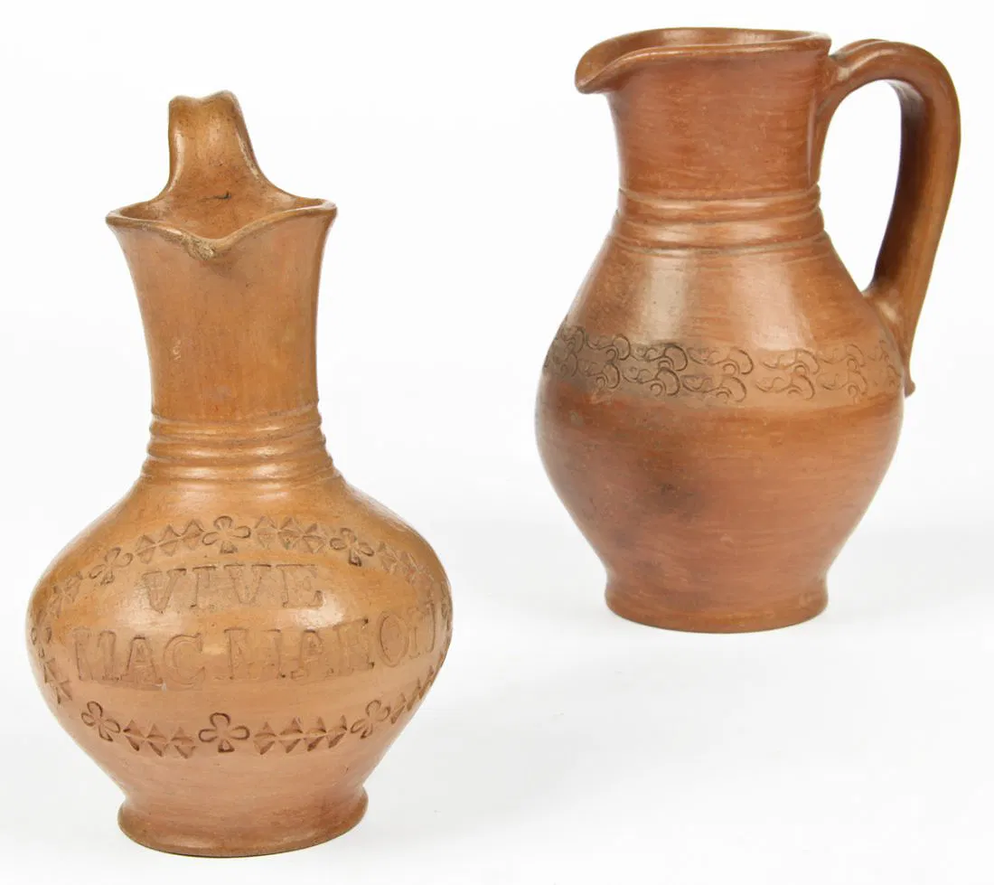 2 Antique St Martin/Maarten pottery ewers. One inscribed ” Viva MacMahon” and the other inscribed with an abstract floral motif. Size: taller 9.5″ x 6″ x 5.5″ (24 x 15 x 14 cm). Provenance: Private Philadelphia collection.