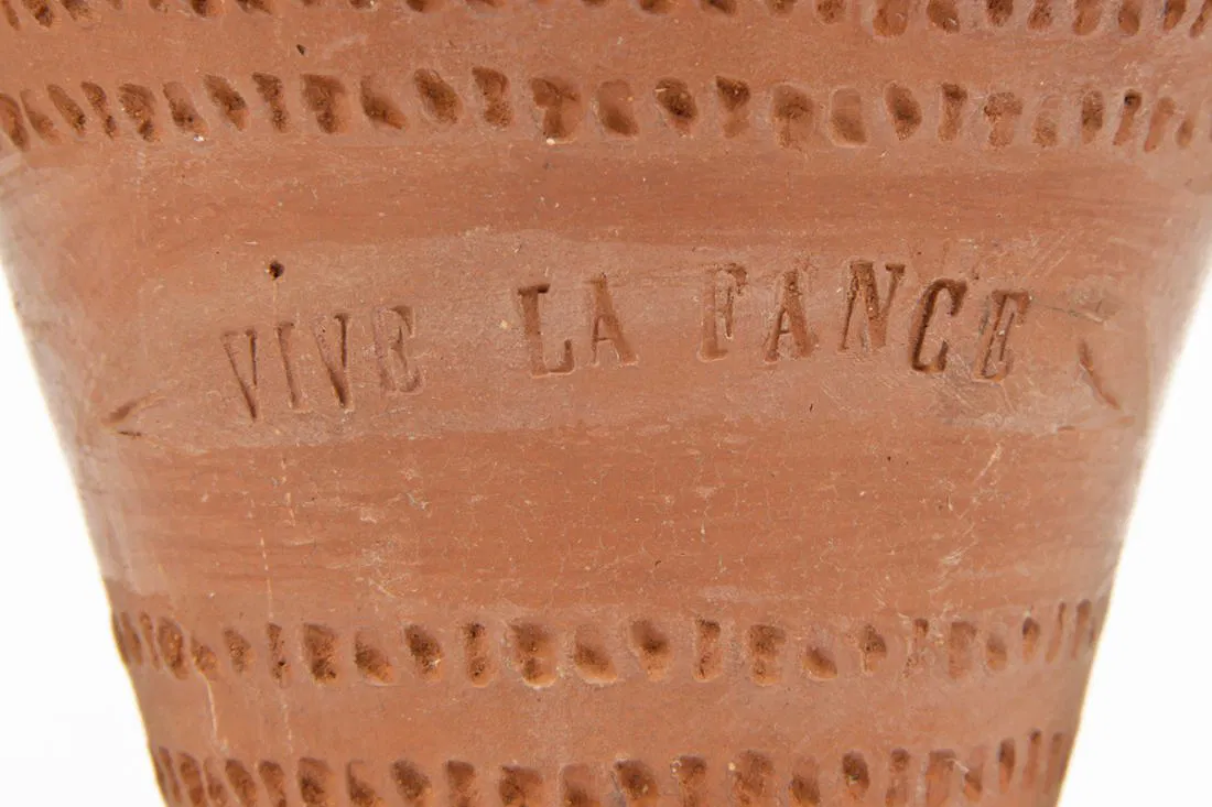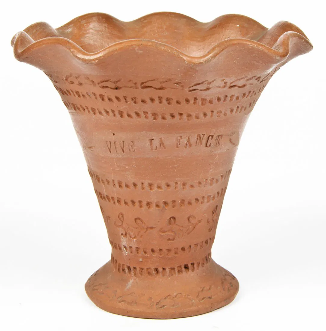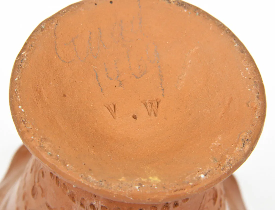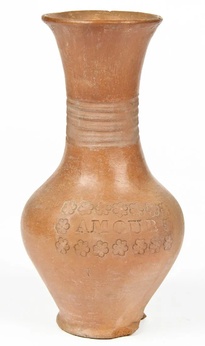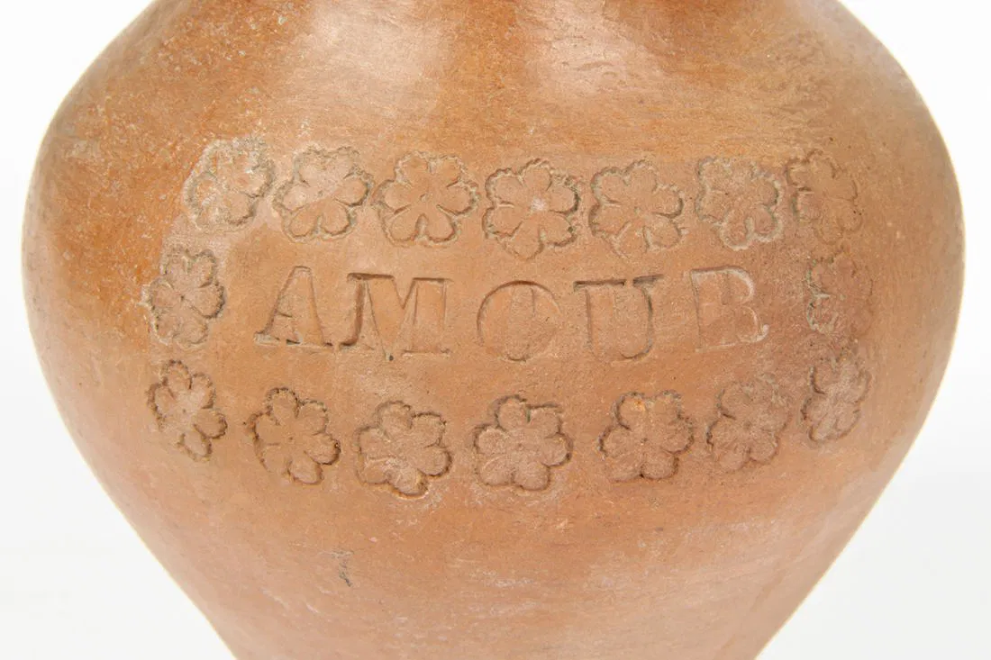 2 Antique St Martin/Maarten Pottery vases. One inscribed “Amour” and the other in a floral motif. The former stamped with the letter “C” and the latter with the initials “V.W”. Size: 10.5″ x 5″ diameter (27 x 13 cm). Provenance: Private Philadelphia collection.