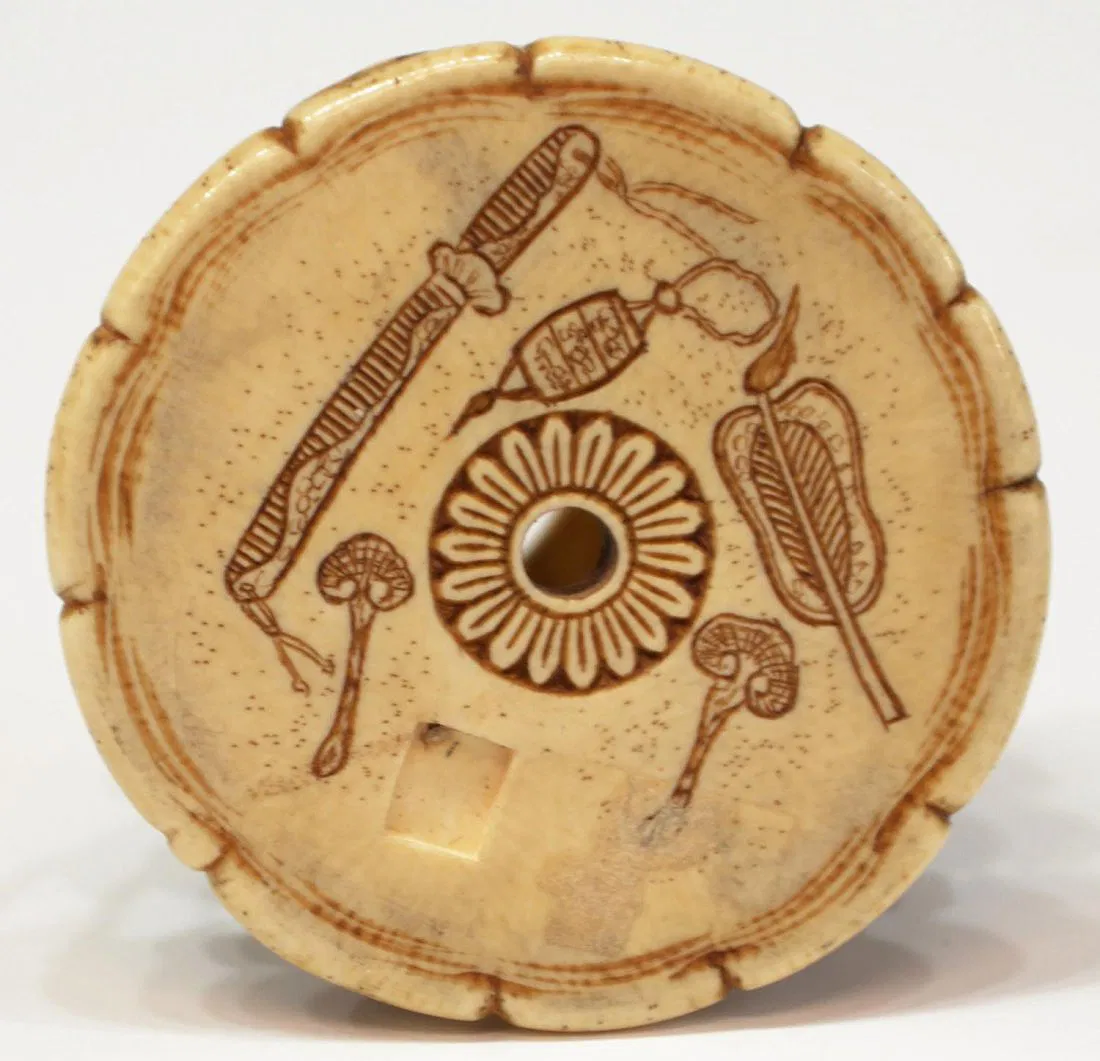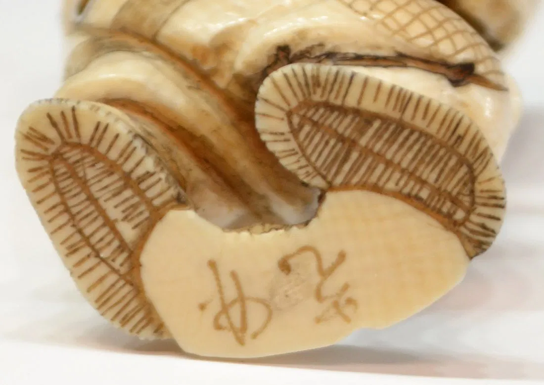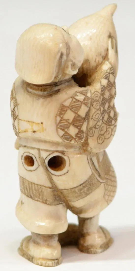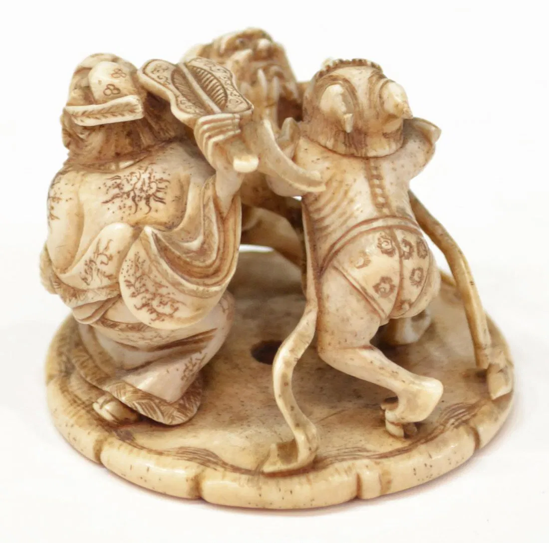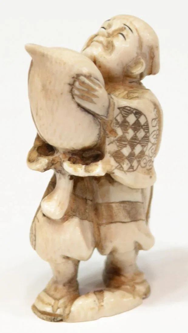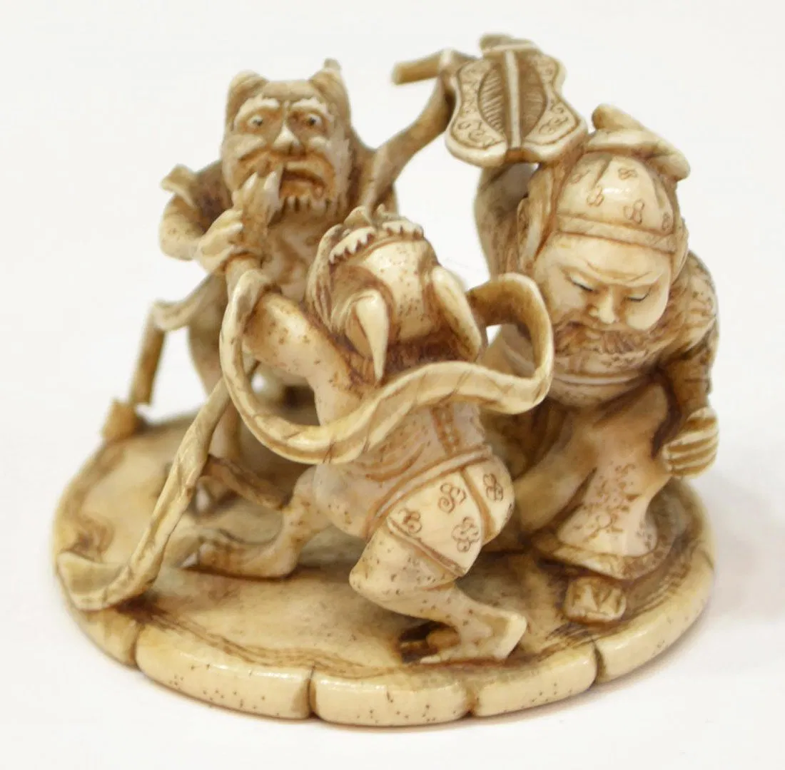 This item will not be shipped Internationally* –(lot of 2) Japanese ivory sculptural ornaments (okimono), 20th century: (1) standing townsman holding a giant peach(?), signed Chikuko/Takemitsu, 2.25″h; (1) the Chinese general Shoki pursuing two demons, with stained accents, inlaid signature cartouche lost, 1.5″diam;