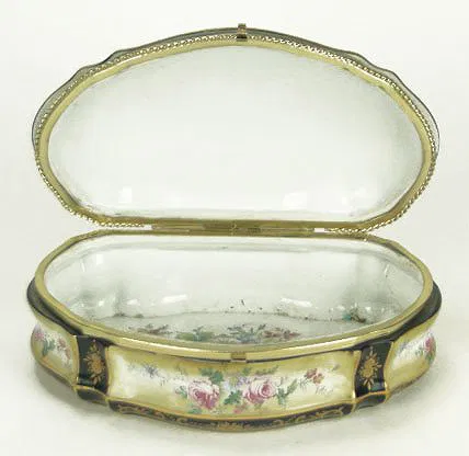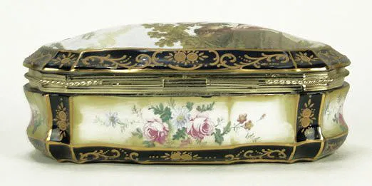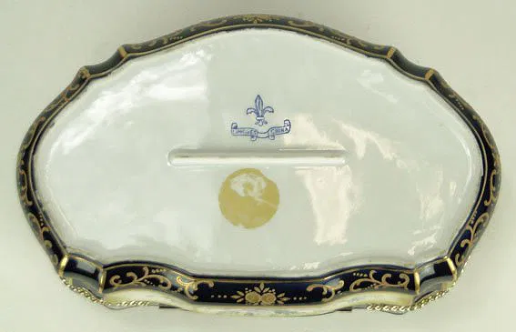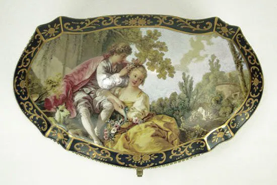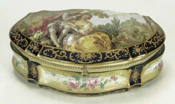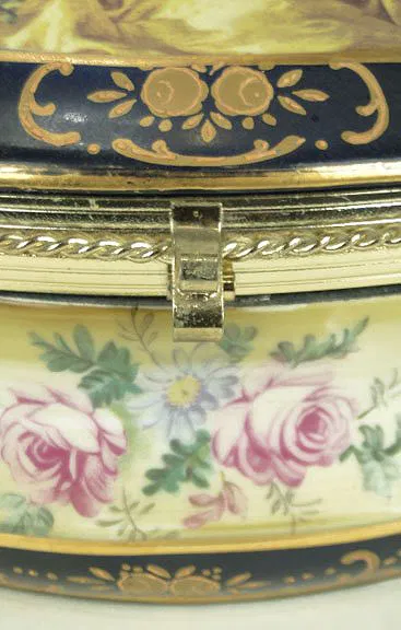 20C LIMOGES DECORATED DRESSER BOX with Courting Scene to Top Flower to Sides with Hand Painted Gold Trim Measures Approximately 11 Inches Across & 3 Inches Tall