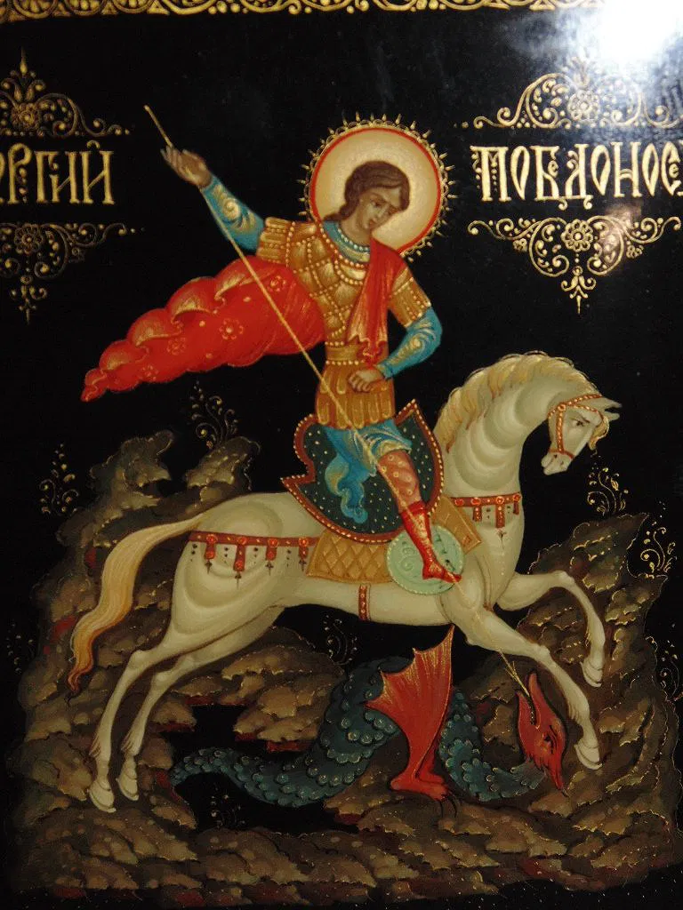 This lot is for 20th C. Russian handpainted lacquer box. The handpainting on the box is of St. George slaying the dragon. It is 4 1/8″ x 3 3/8″ x 1 1/8″ high.