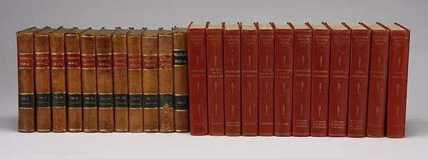 Grouping of 23 leather bound and cloth bound books with tooled gilt covers, includes (12) books titled “Smithsonian Scientific Series, Patron’s Edition”, circa 1935, 9.5″h x 7″w and (11) books titled “The American Journal of Science and Arts” by Professor Silliman, circa 1846, 9″h x 6″W.