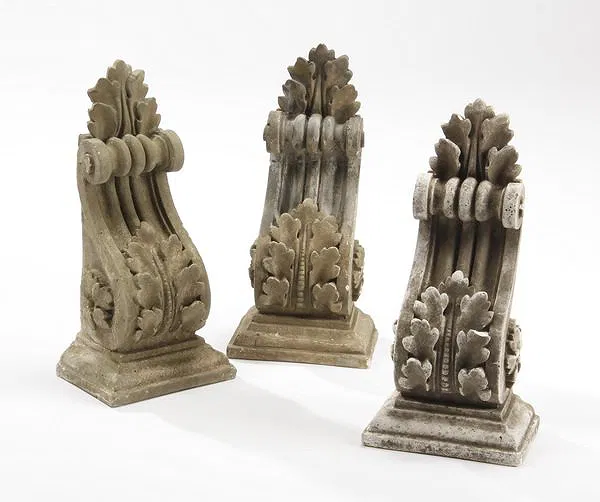 Set of three acanthus-form cast stone corbels, each 21″h x 6″w x 7″d.