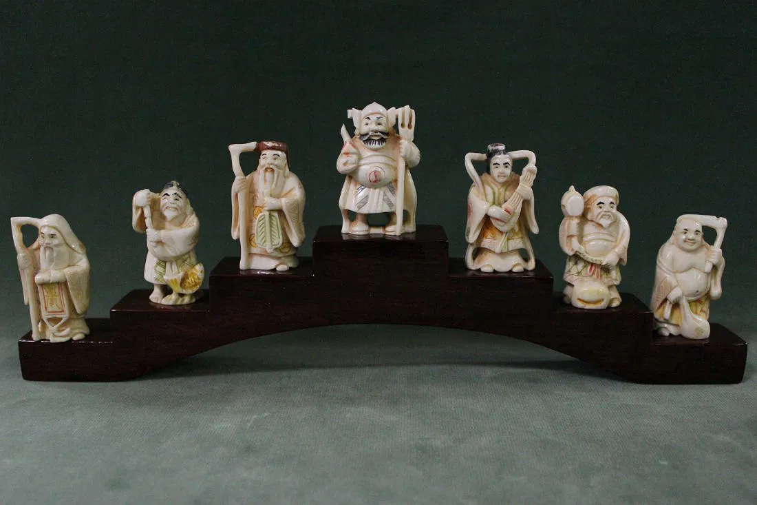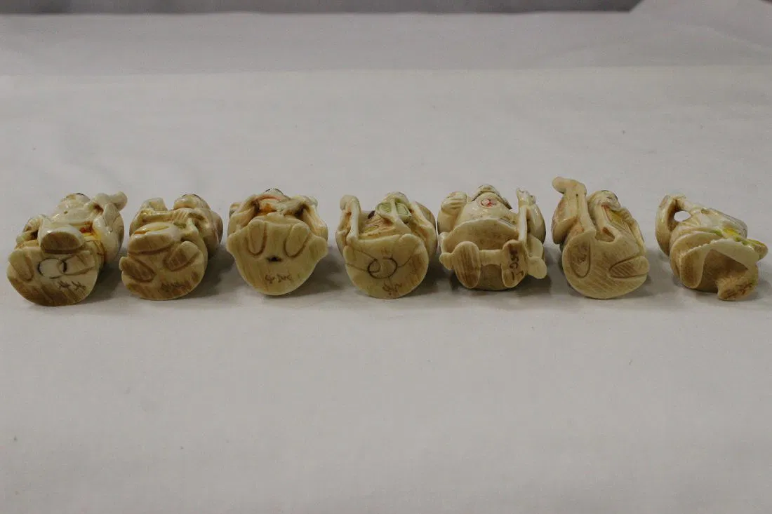7 Japanese ivory carved netsuke (2.1″H each) on stand (2.45″Hx12″x1.15″)