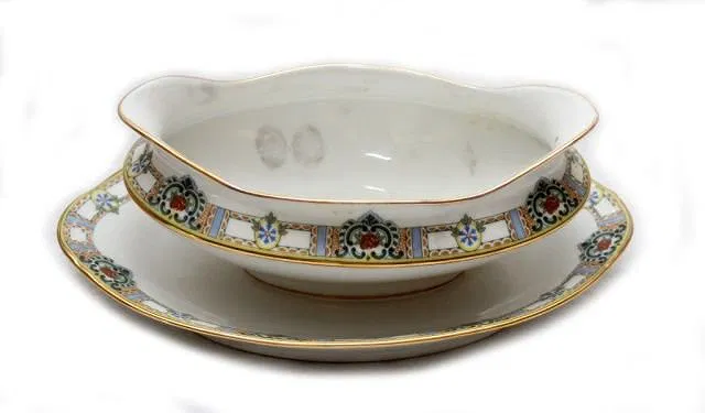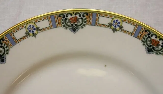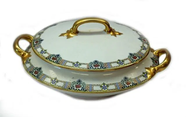 Early 20th century Limoges French porcelain hand painted floral China set including; 12 dinner plates, 11 luncheon plates, 12 salad/dessert plates, 13 bread and butter plates, 10 fruit/ice cream bowls, 8 teacups, 12 saucers, 3 graduating oval serving platters, 1 oval dish, 1 oval gravy boat with attached underplate, 1 oval vegetable serving bowl, 1 round covered casserole and 1 oval covered casserole. Some pieces hold Mandavy de Mavaleix maker marks and others hold Mavaleix et Cie./Mavaleix et Granger green underglaze marks. Circa 1910’s-1920’s.
