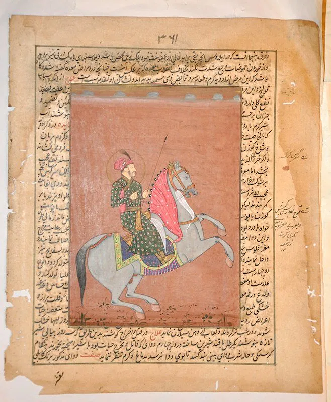 A 19th-century Eastern illuminated manuscript depicting a figure on a rearing horse.