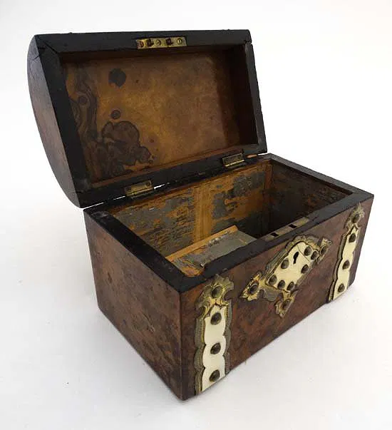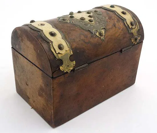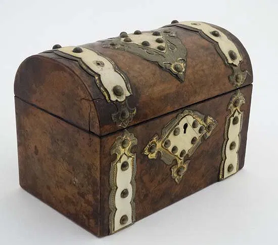 A 19thC walnut semi domed caddy with ivory and brass strap decoration 5 5/8” high x 7 7/8” wide