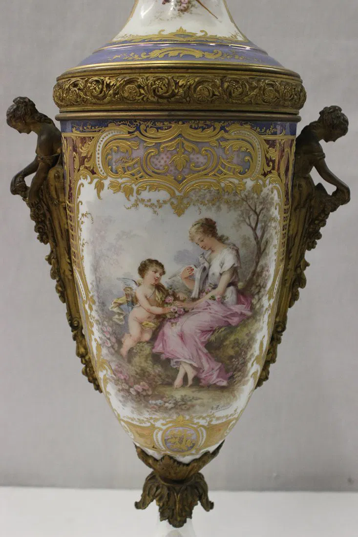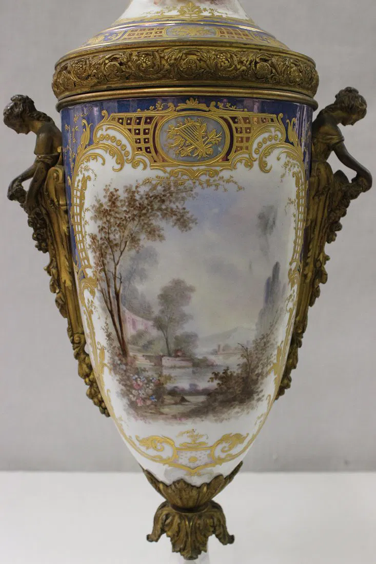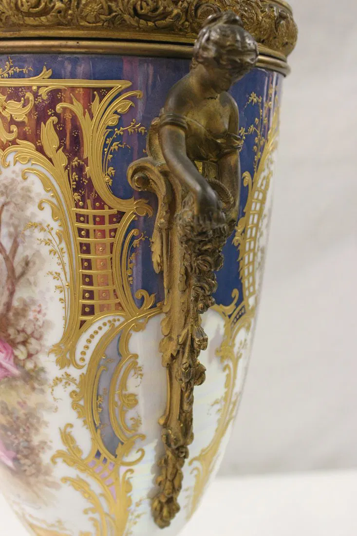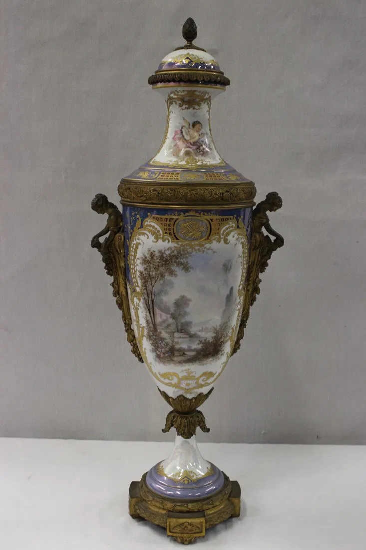 A beautiful antique Sevre’s porcelain vase with figural bronze ormolu, panel painted with landscape and fairy tale scene, 27.5″Hx10.25″x7.25″