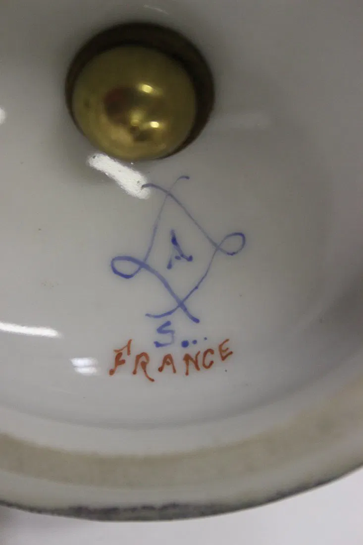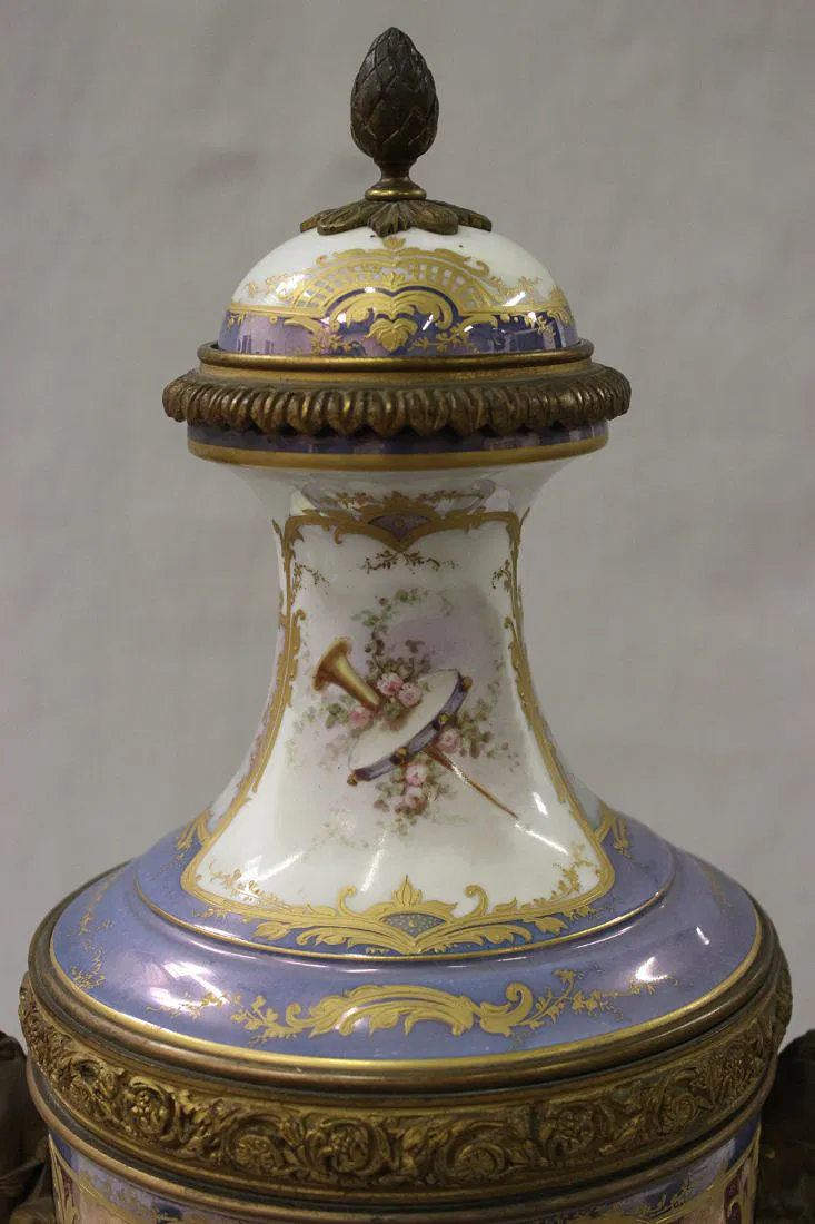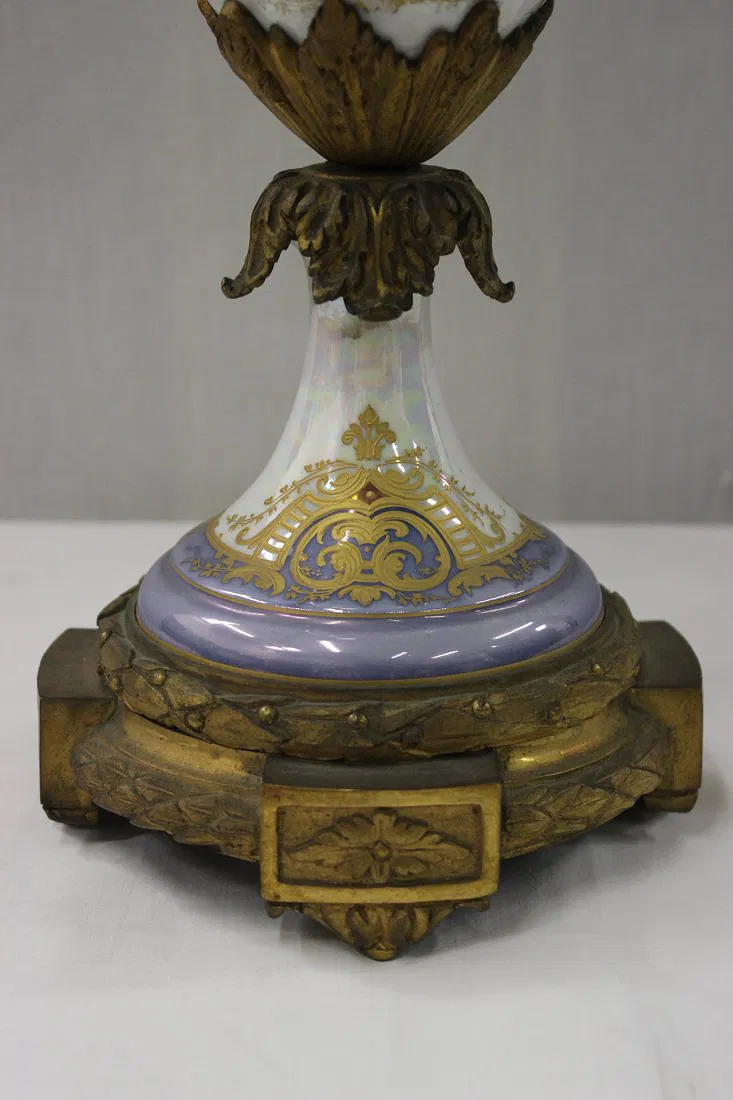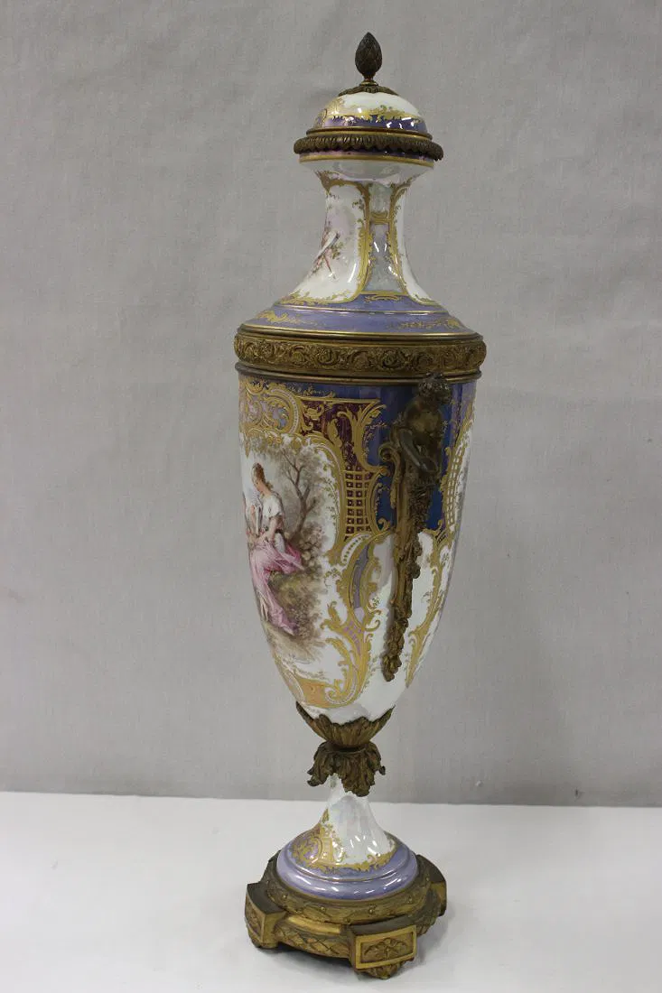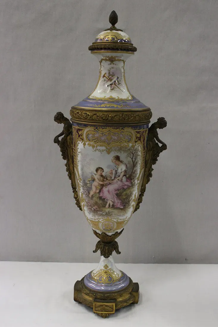 A beautiful antique Sevre’s porcelain vase with figural bronze ormolu, panel painted with landscape and fairy tale scene, 27.5″Hx10.25″x7.25″