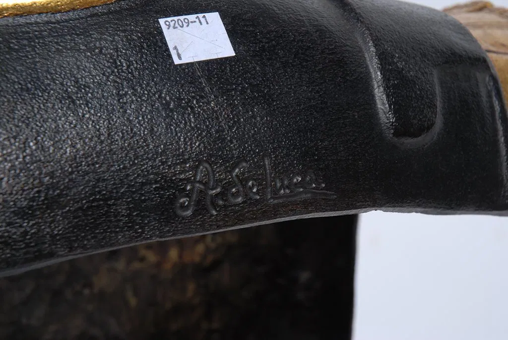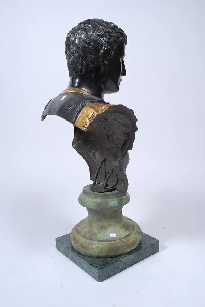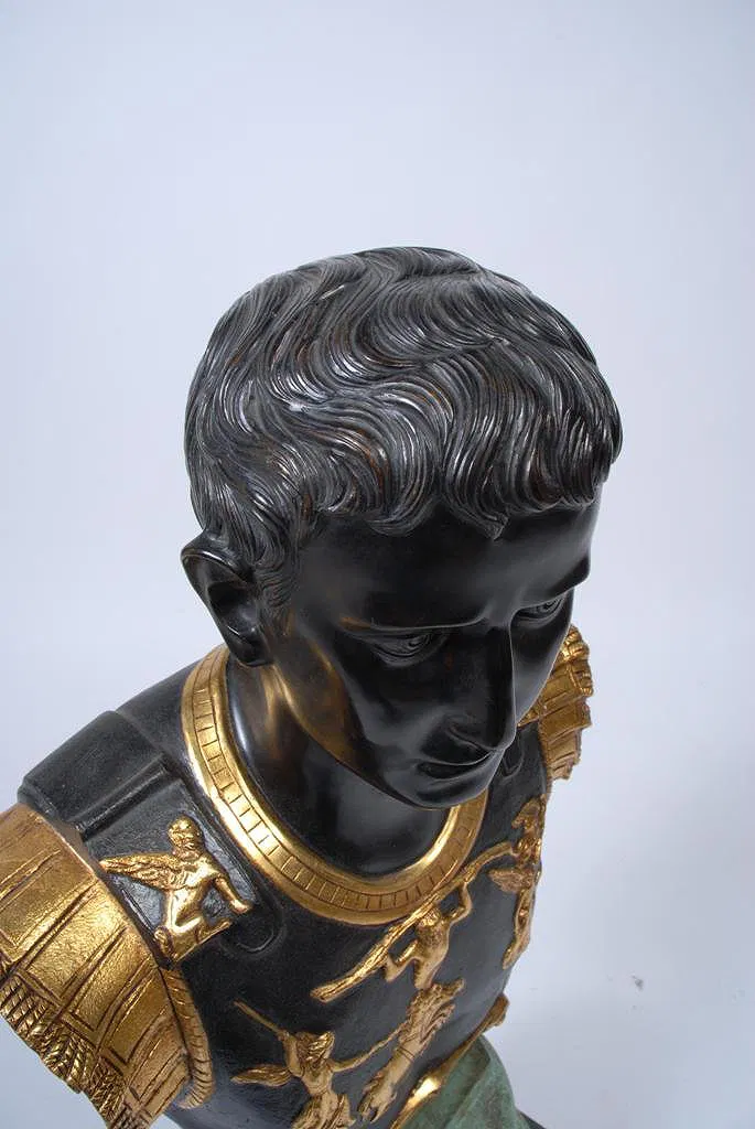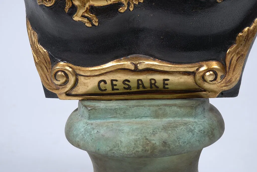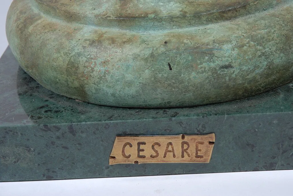 The figure’s breast plate decorated with raised gilt angels and chariots. Signed A. de Luca. Bearing a name plate reading “Cesare” on a green patinated column base, mounted on a green marble plinth. 32″H X 17″W