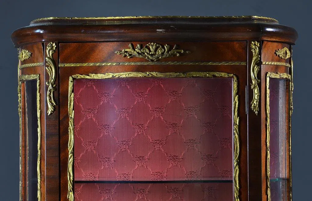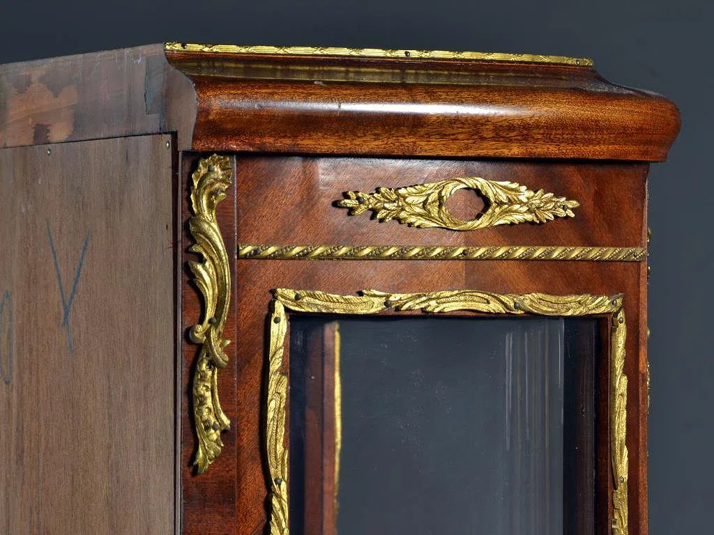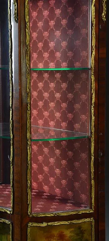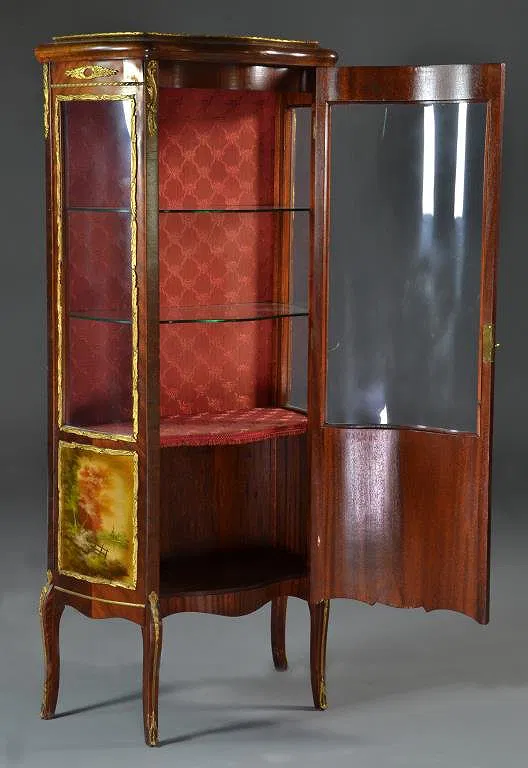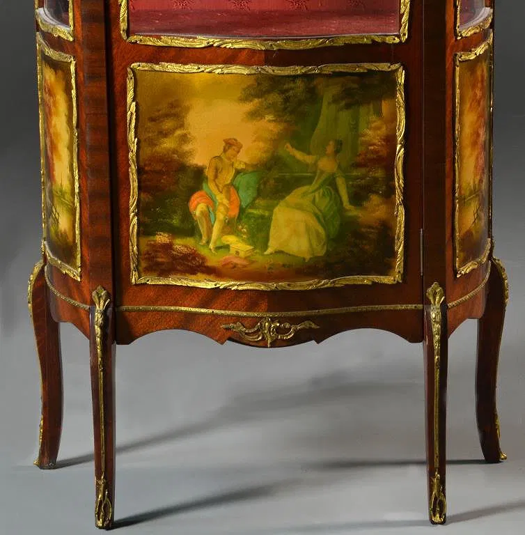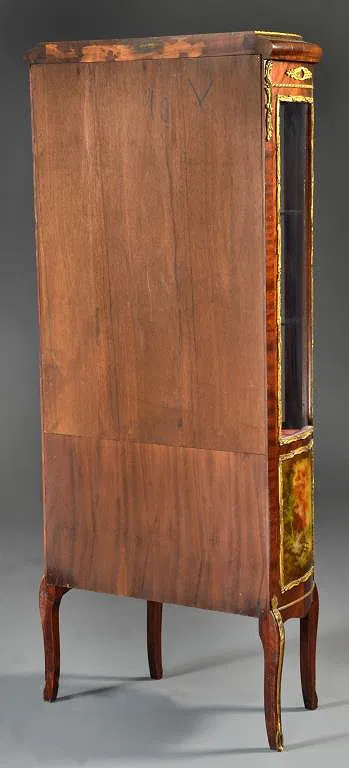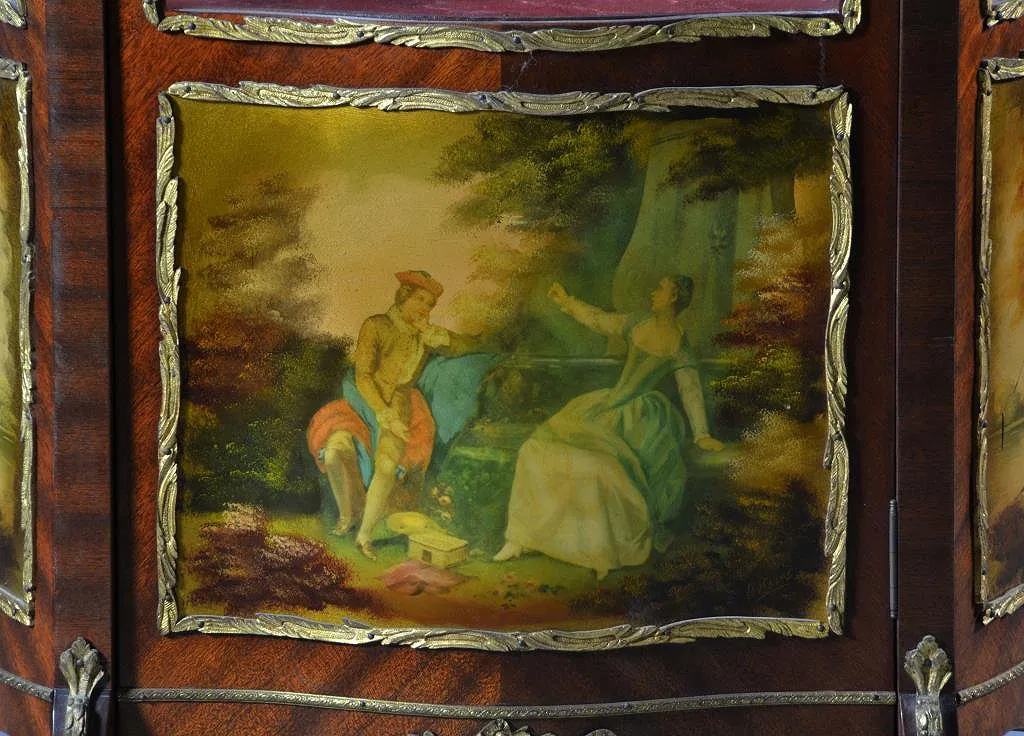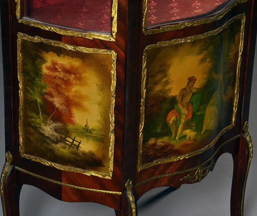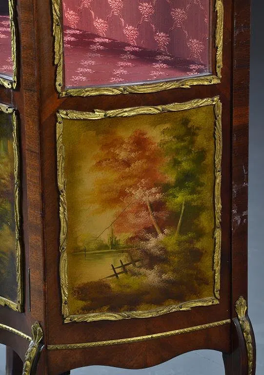 Having one door opening to a shelved interior, having gilt metal or gilt bronze mounts throughout, with Vernis Martin style panels, measures 59.5″H x 26.5″W x 14″D, circa early 20th century.