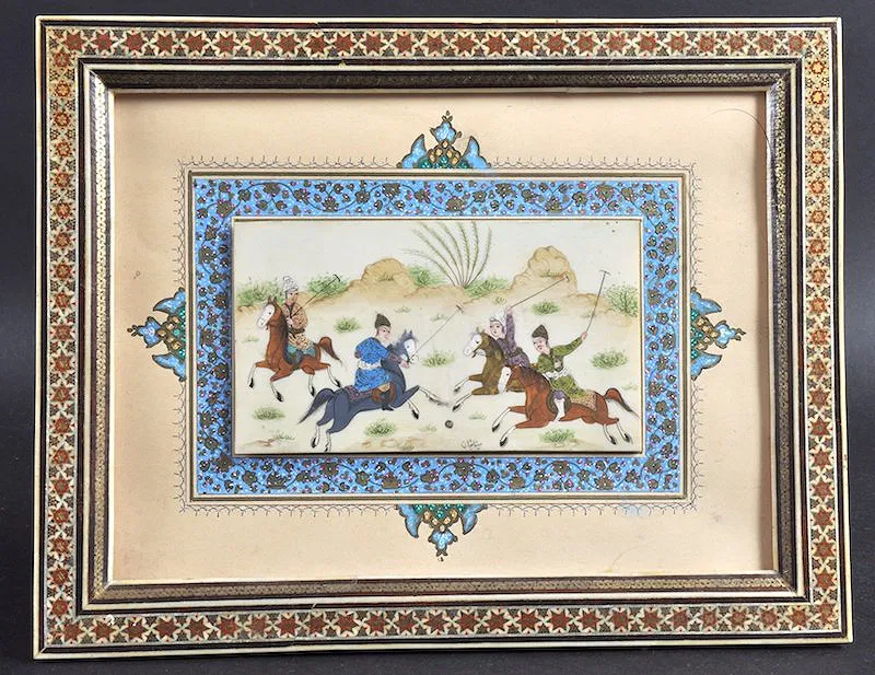 A Persian ivory-framed plaque, titled “Playing Polo.” Measures approximately 7.5 × 14 cm (3 × 5.5 in).
