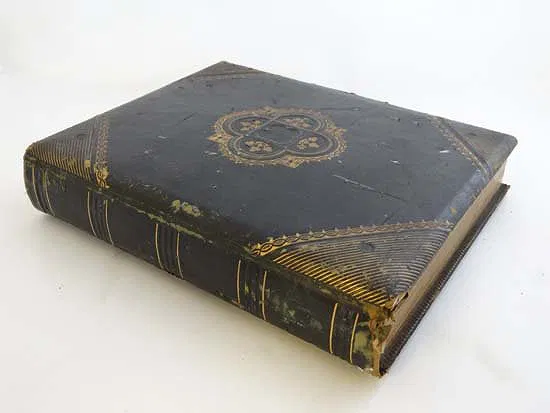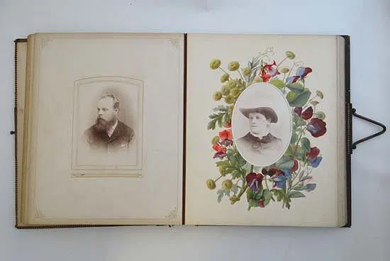 A Victorian gold tooled black leather photograph album containing a large quantity of assorted Victorian Portrait photographs some with polychrome printed floral and foliate decoration surround. 13 1/8″ high