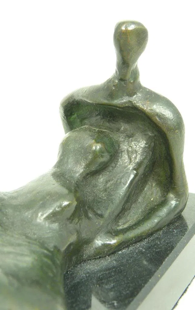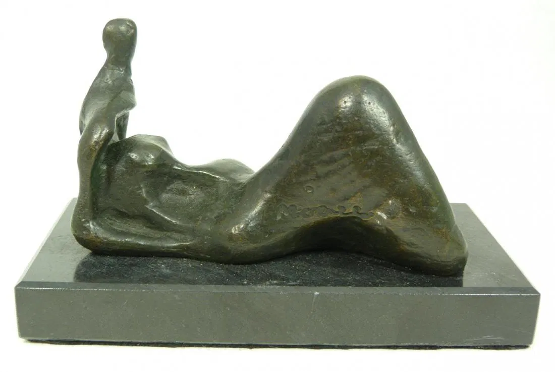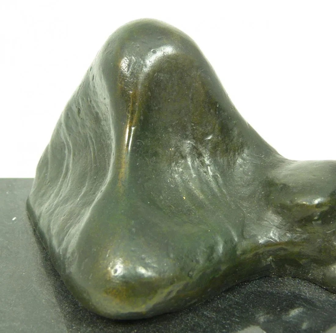 Abstract bronze figure depicting a recumbent figure. Mounted on a black marble plinth. Signed ‘Moore’ on verso. After Henry Moore (BRITISH, 1896-1986). Measures 2 3/4 inch height (7 cm) x 5 inch length (12.7 cm) x 7/8 inch base height (2.2 cm). Total weight of 1161 grams.