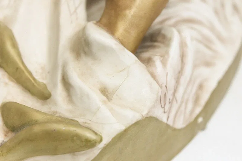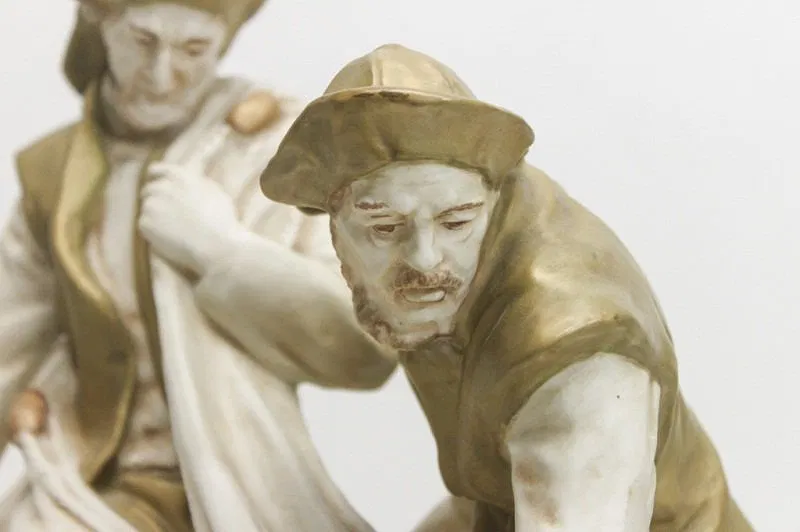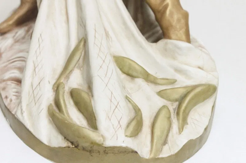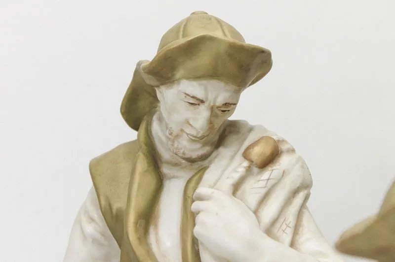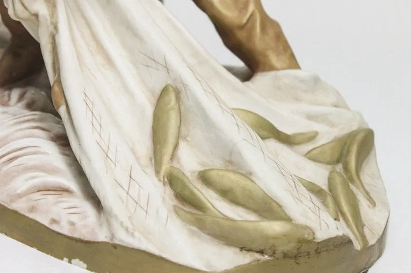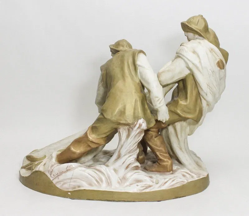 Amphora figurine depicting two fisherman pulling in their fishing net and catch of the day. Measurements: 17″ x 10.25″ x 16″ Style: Early 20th Century