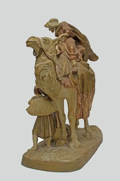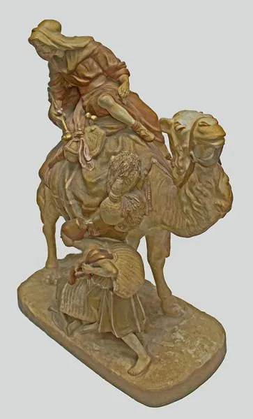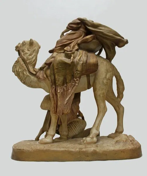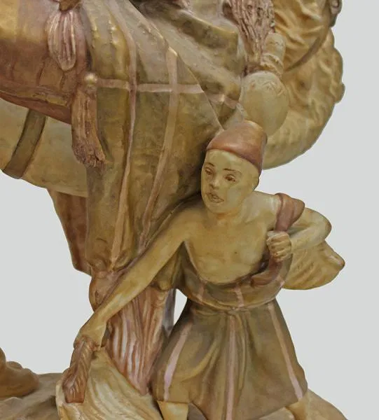 Amphora Royal Dux figural group of an Arab on a camel tended by a slave Boy. Large and finally detail piece with an excellent original finish. Austria hallmark. Measurements: 20″ x 10″ x 24.75″ Artist: Amphora Style: Early 20th Century