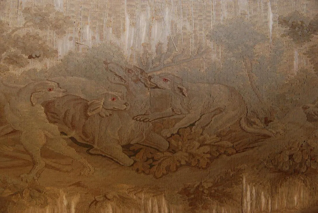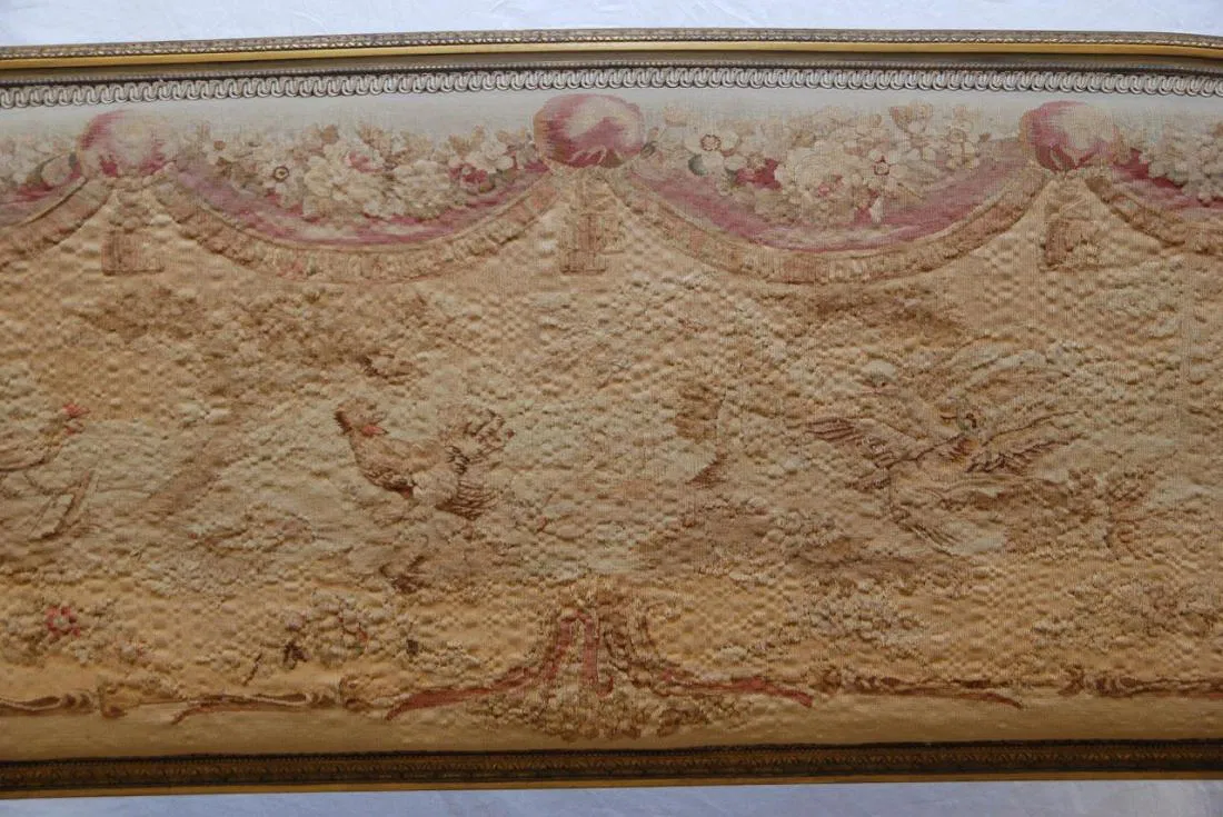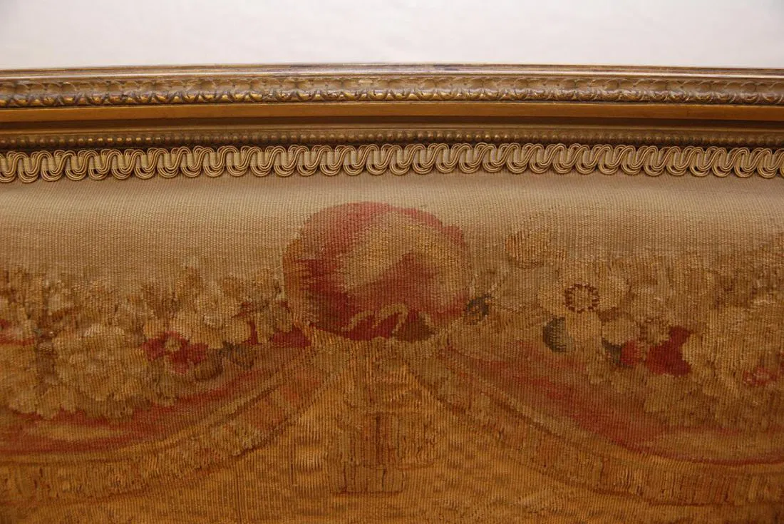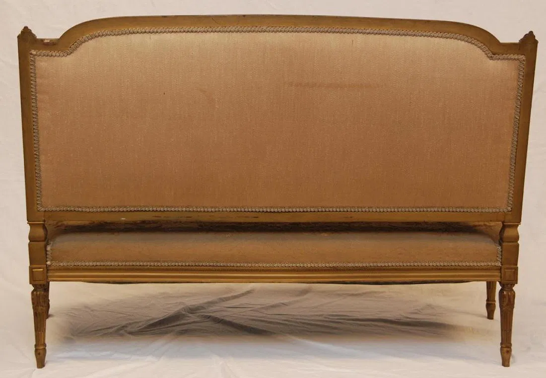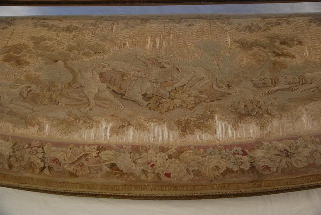 An antique Louis XV style gilded wood settee. Has yellow fabric depicting a dog hunt scene. 19th century. Measures 41″ height x 62″ length x 30″ depth (104cm x 157cm x 76cm).