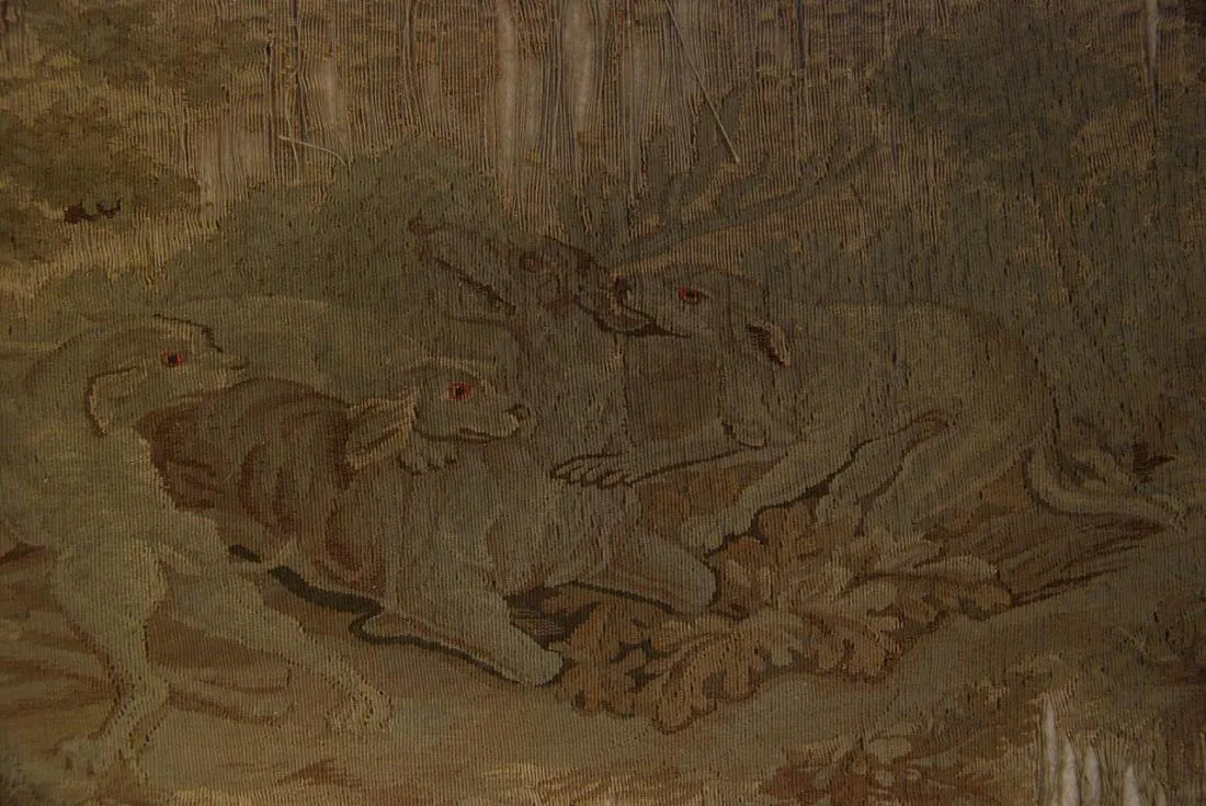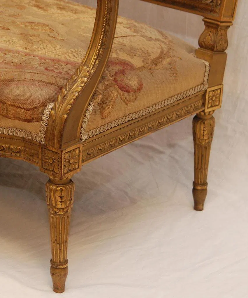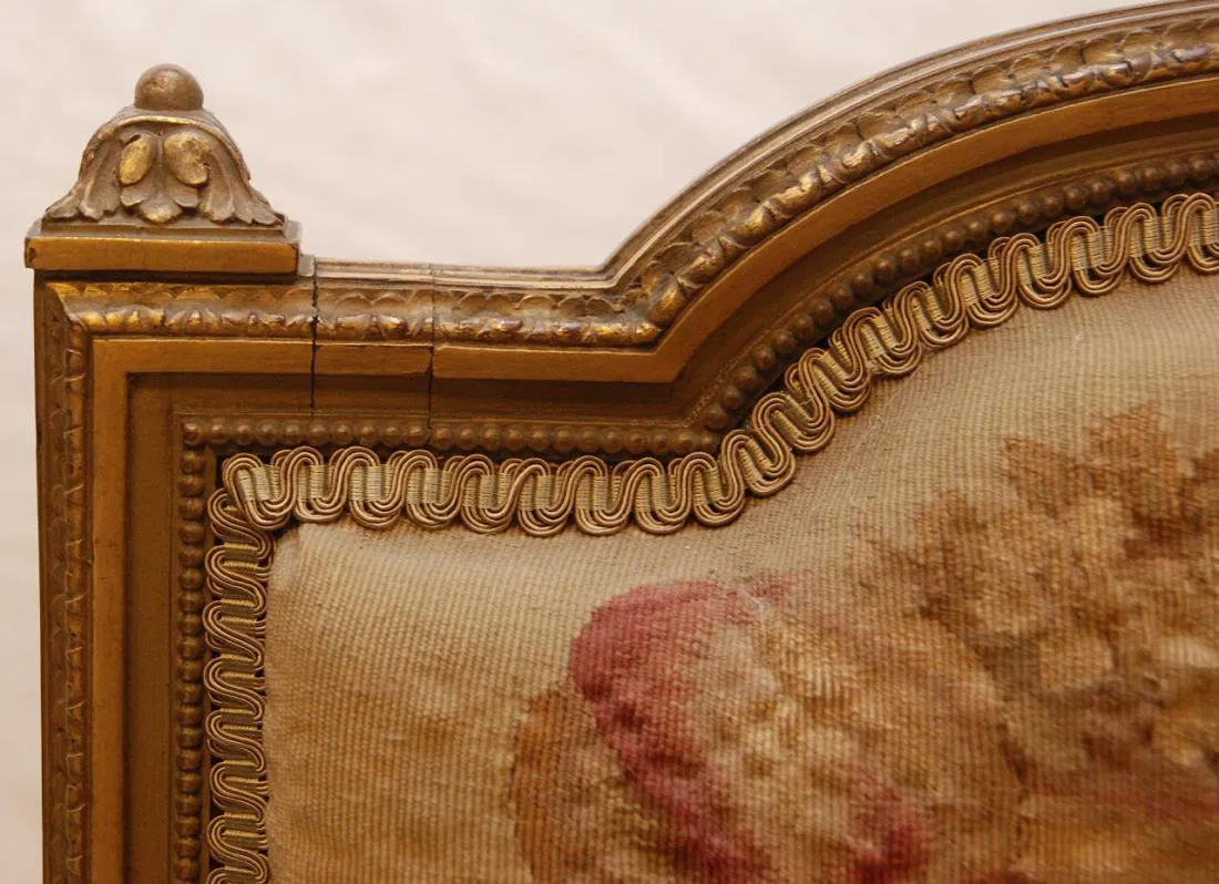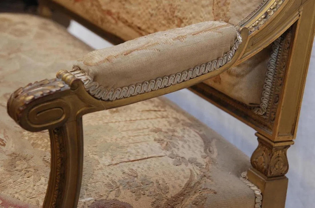 An antique Louis XV style gilded wood settee. Has yellow fabric depicting a dog hunt scene. 19th century. Measures 41″ height x 62″ length x 30″ depth (104cm x 157cm x 76cm).