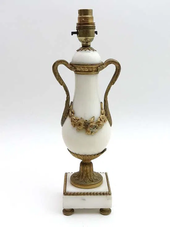 An unusual Art Deco white marble urn shaped table lamp with gilded brass detail on a squared four footed base. approx 13 3/4″ high