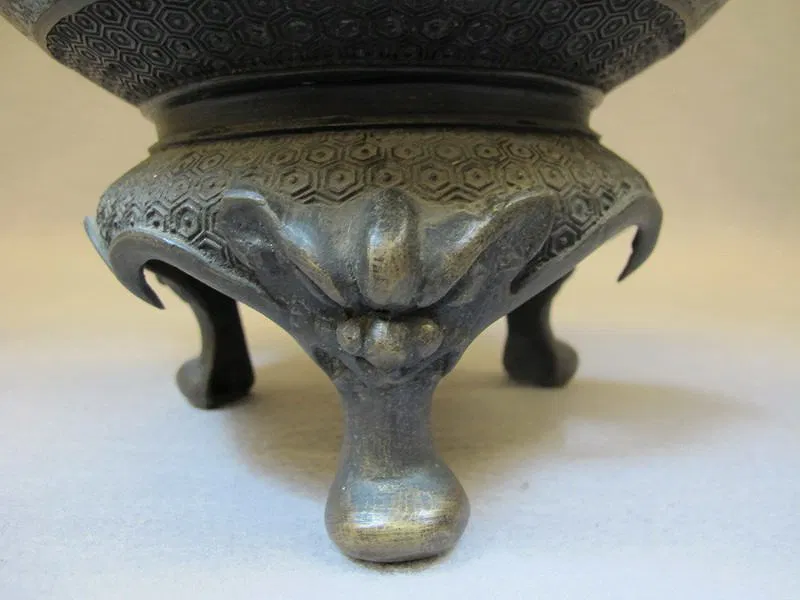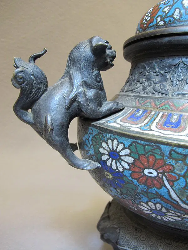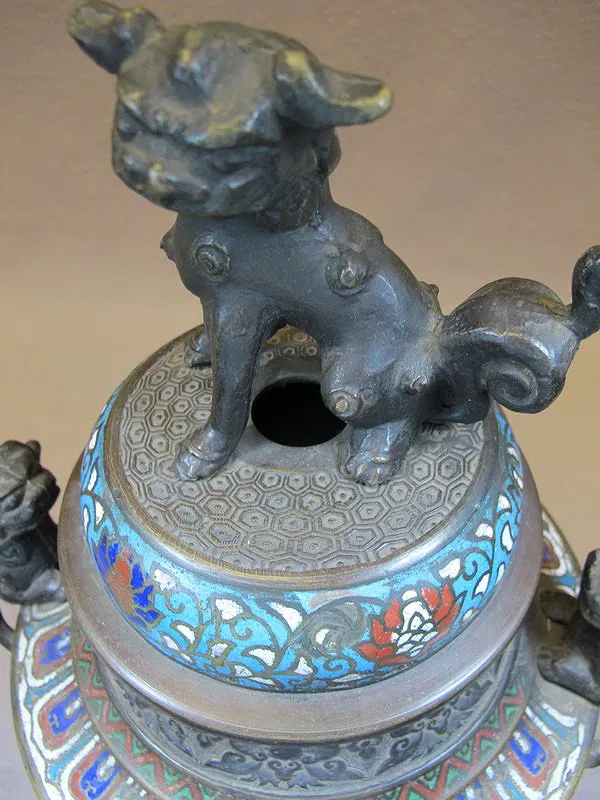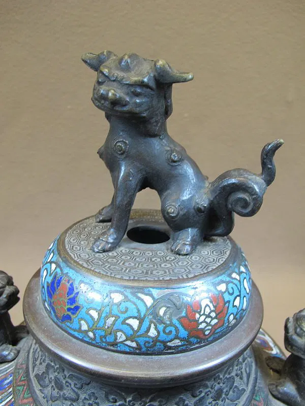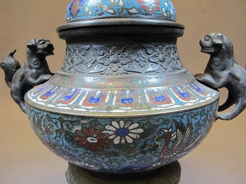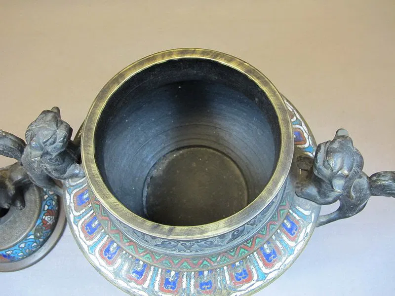 Antique Chinese bronze cloisonet censor, marked. 16 1/2″ H x 13 1/2” W.