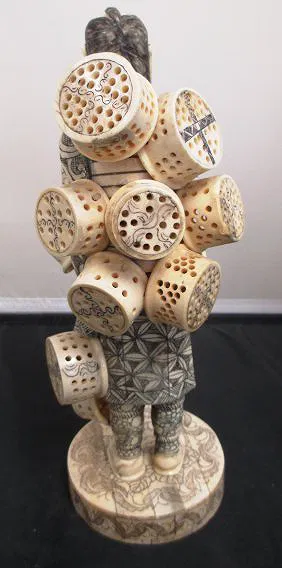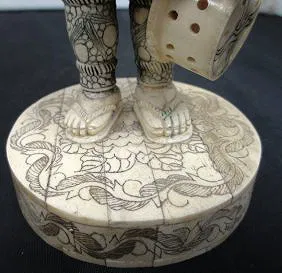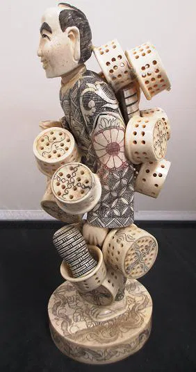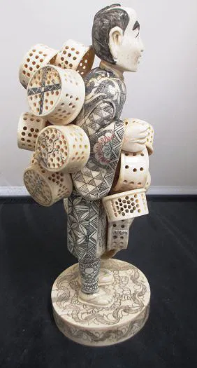 Antique Ivory Hand Carved Japanese Fisherman carrying 17 Baskets. Dressed in Traditional Garment comes on circular base with Chrysanthum on bottom of base. Measures 10 1/2″ Tall by 4″ Wide. Weights 777.8 Grams. Please note we do not ship Ivory Internationally or to California. Check your local State Law.