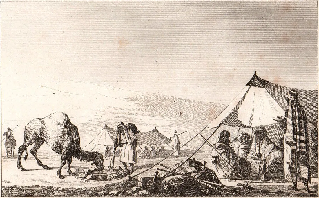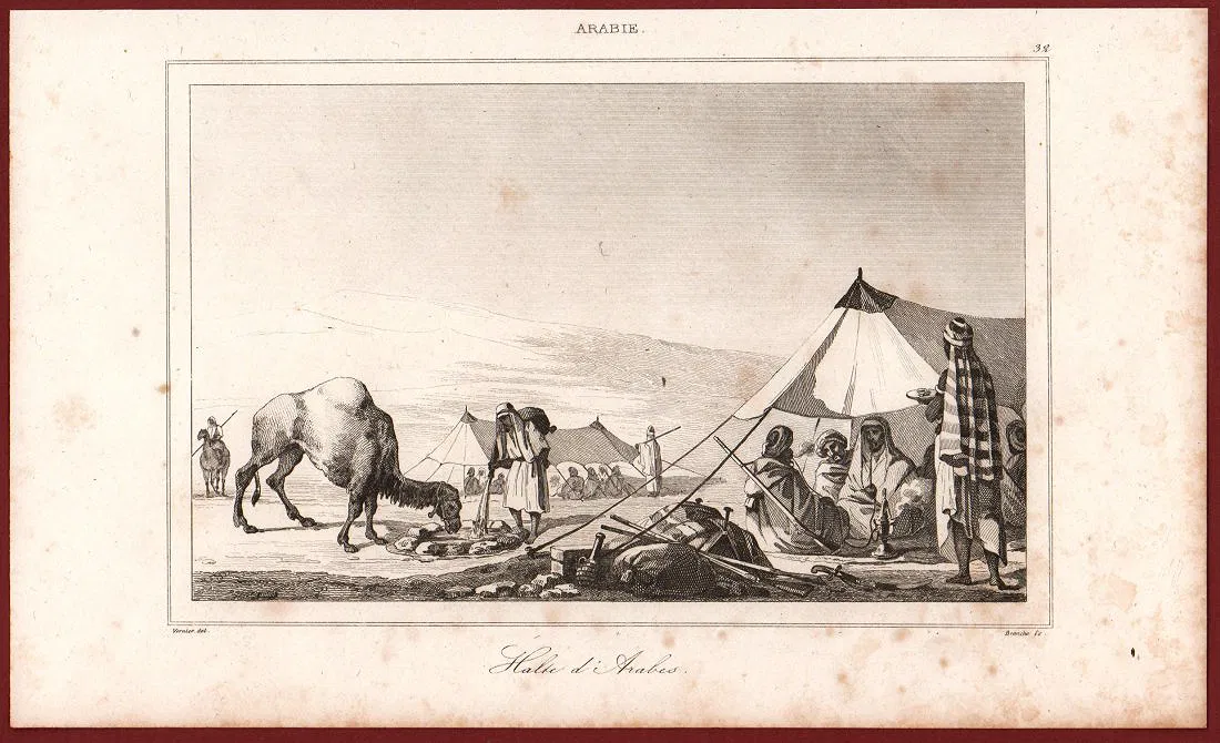 Item Details Description Print of steel engraving titled „Halte d’Arabes.“. Drawn by Vernier. Engraved by Branche. From „Arabie, par M. Noel Desvergers, vice-president de la societe de geographie, Avec une carte de L‘arabie et note sur cette carte, par M. Jomard, membre de l‘institut. Paris, Firmin didot freres, editeurs, imprimeurs de l‘institut de France, 1847. Arabian Peninsula, simplified Arabia is a peninsula of Western Asia situated north-east of Africa on the Arabian plate. From a geological perspective, it is considered a subcontinent of Asia. It is the largest peninsula in the world, at 3,237,500 square kilometers. The Arabian Peninsula consists of the countries Yemen, Oman, Qatar, Bahrain, Kuwait, Saudi Arabia and the United Arab Emirates as well as parts of southern Iraq and Jordan.[2] The peninsula formed as a result of the rifting of the Red Sea between 56 and 23 million yea