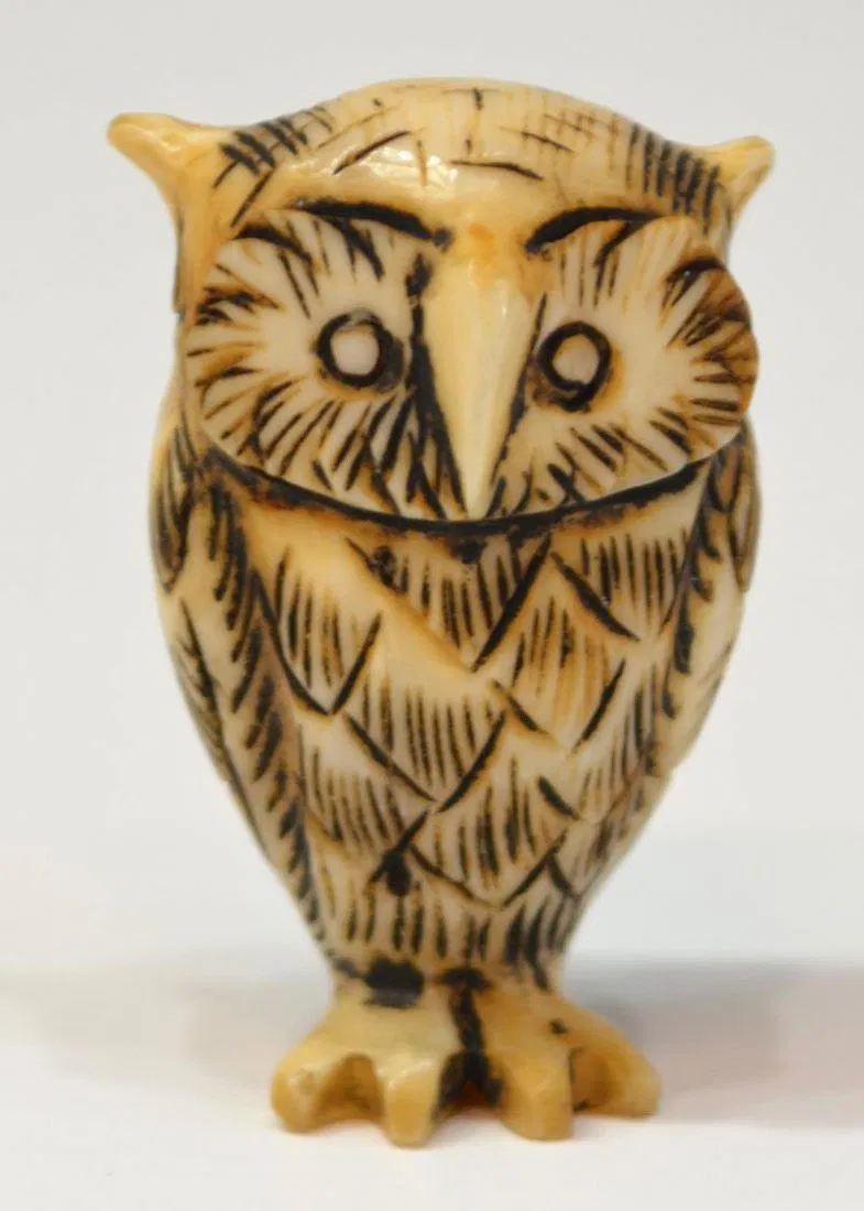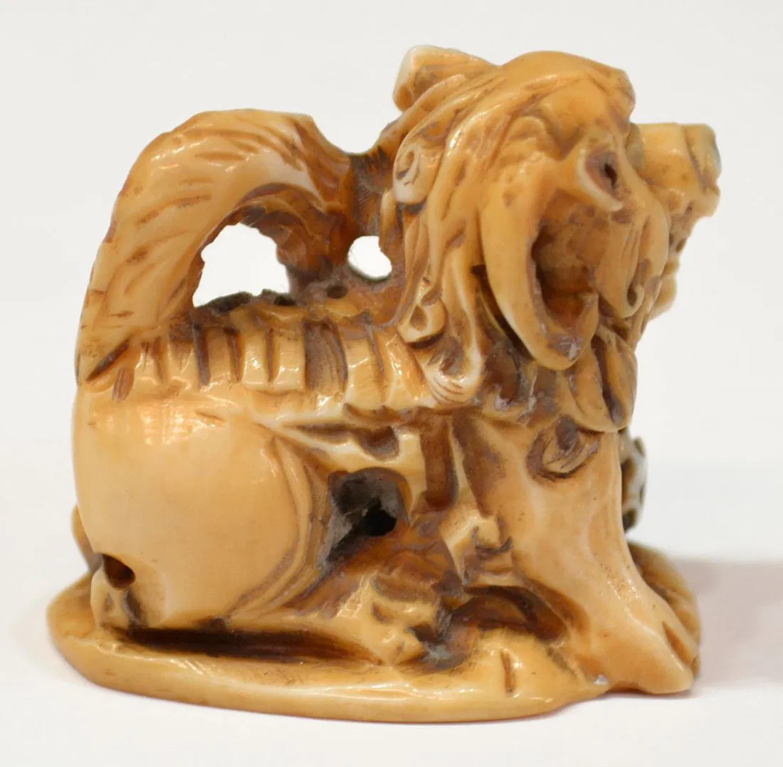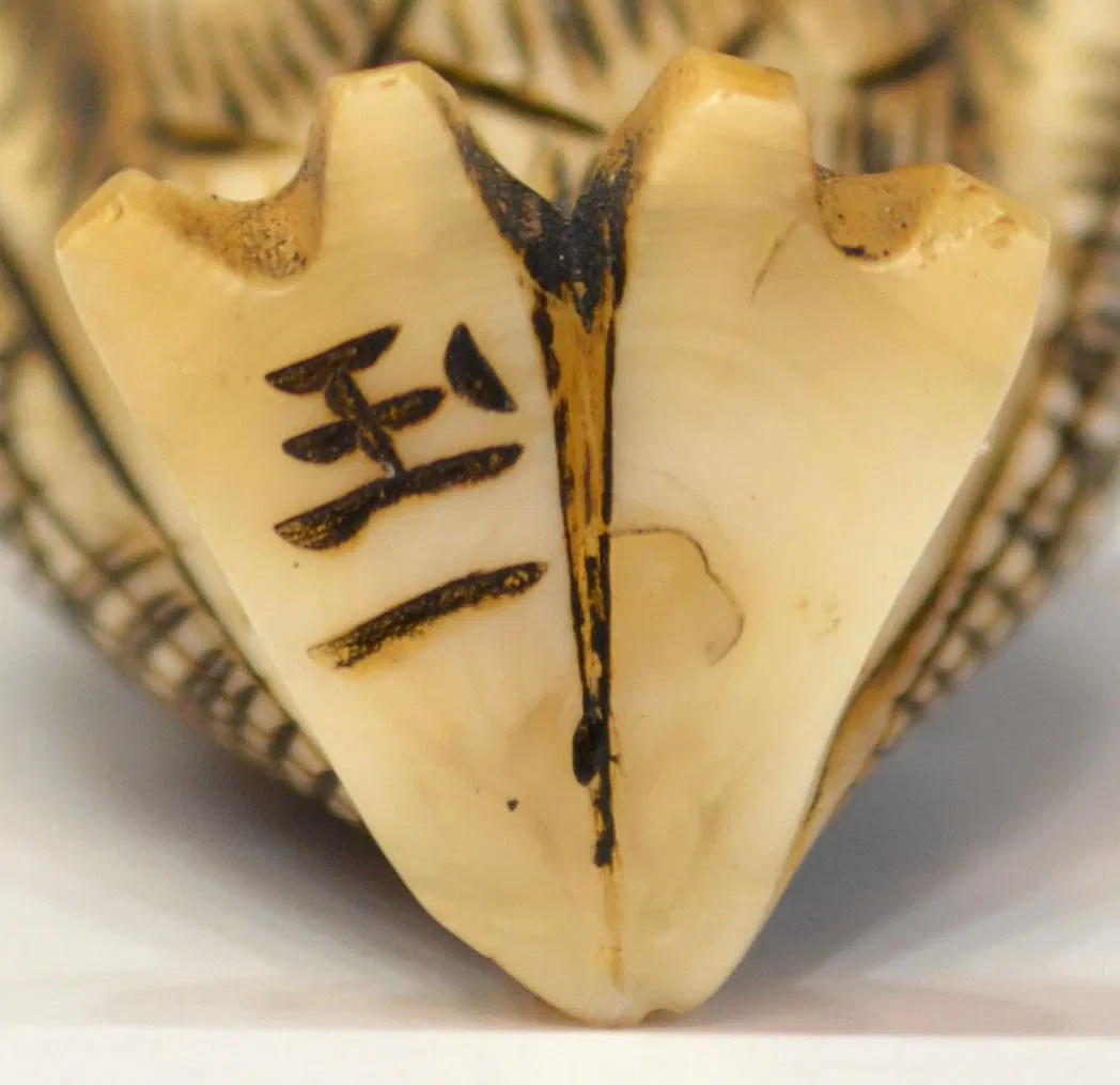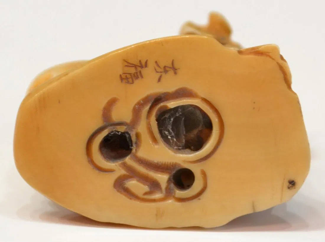 This lot will not be shipped Internationally* (lot of 3) Asian carved ivory netsuke, each signed as pictured, 20th c.: (1) figure of a fu lion with a ball, signed Tofu, 1.5″h; (1) owl, signed Tamakazu, 1.5″h; (1) plaque of the head of a folk figure, signed Masakazu, 1.5″h;