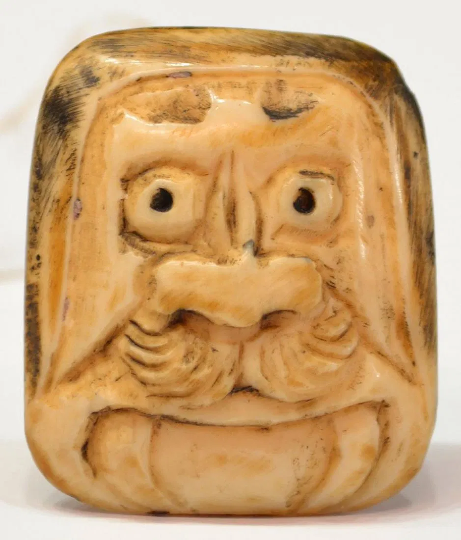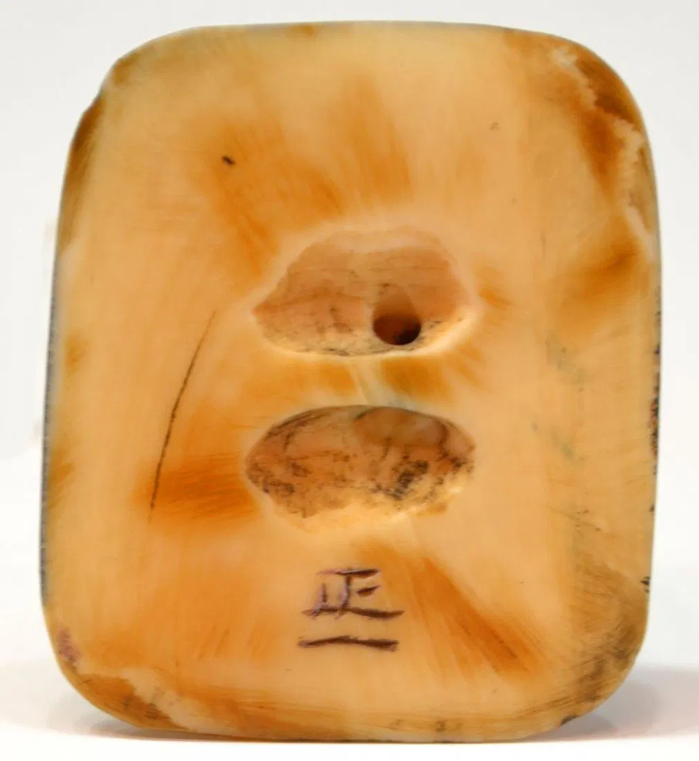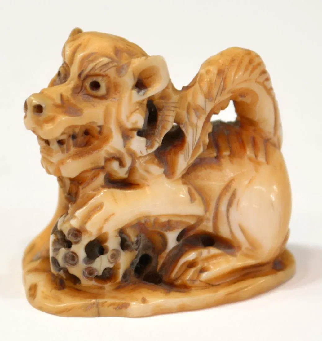 This lot will not be shipped Internationally* (lot of 3) Asian carved ivory netsuke, each signed as pictured, 20th c.: (1) figure of a fu lion with a ball, signed Tofu, 1.5″h; (1) owl, signed Tamakazu, 1.5″h; (1) plaque of the head of a folk figure, signed Masakazu, 1.5″h;