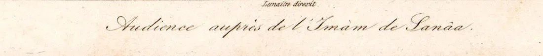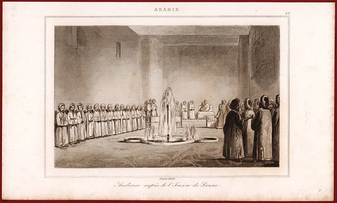 Item Details Description Print of steel engraving titled „Audience aupres de l’Imam de Sanaa“. Drawn by unknown. Engraved by unknown. From „Arabie, par M. Noel Desvergers, vice-president de la societe de geographie, Avec une carte de L‘arabie et note sur cette carte, par M. Jomard, membre de l‘institut. Paris, Firmin didot freres, editeurs, imprimeurs de l‘institut de France, 1847. Situated in a mountain valley at an altitude of 2,200 m, Sana’a has been inhabited for more than 2,500 years. In the 7th and 8th centuries the city became a major centre for the propagation of Islam. Yemen, officially known as the Republic of Yemen, is an Arab country in Western Asia, occupying the southwestern to the southern end of the Arabian Peninsula. Yemen is the second largest country in the peninsula, occupying 527,970 km2. The coastline stretches for about 2,000 km. It is bordered by Saudi Arabia to t