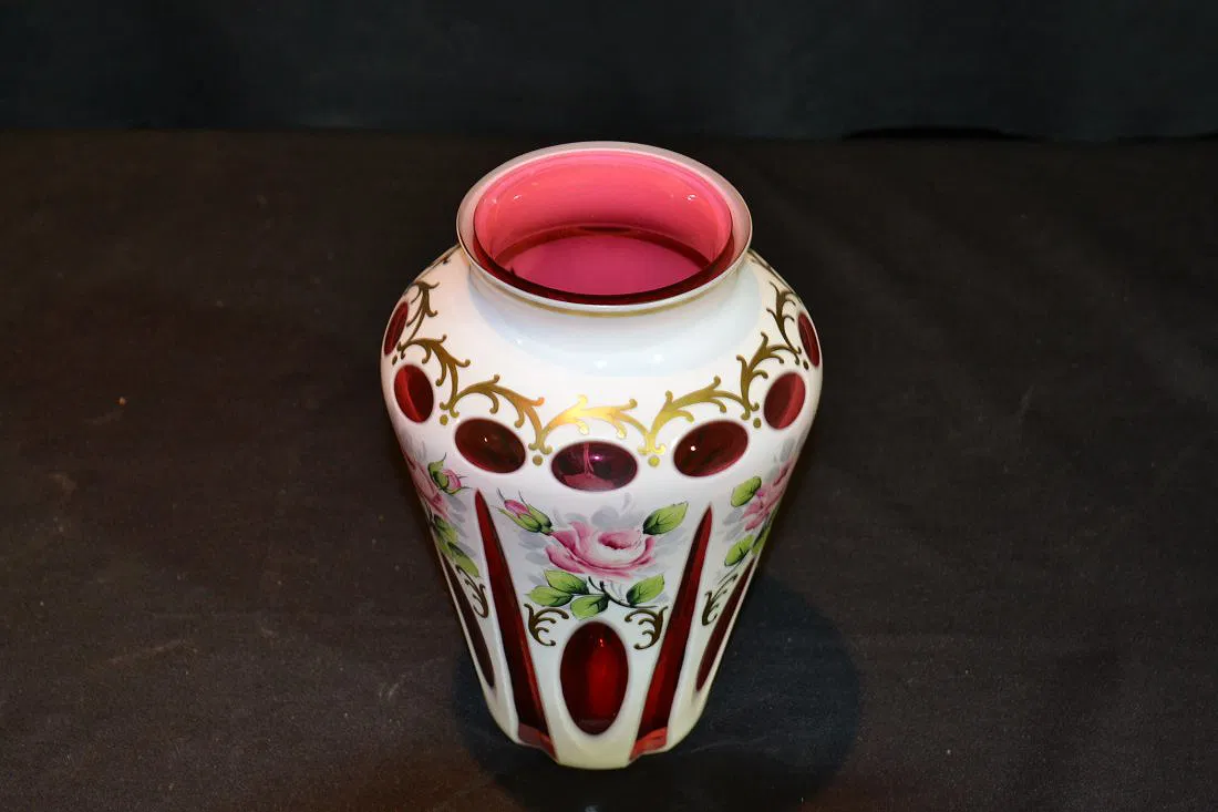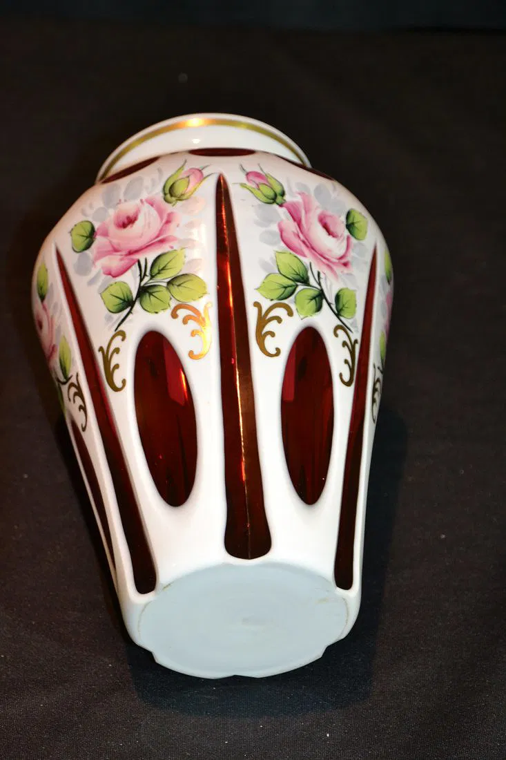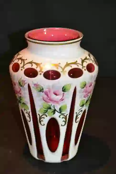 BOHEMIAN CUT TO CLEAR VASE WITH HAND PAINTED