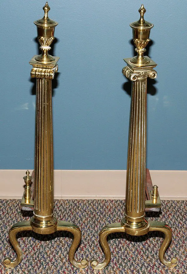 BRASS ANDIRONS, PAIR, H 28″:Fluted columns, urn finials.