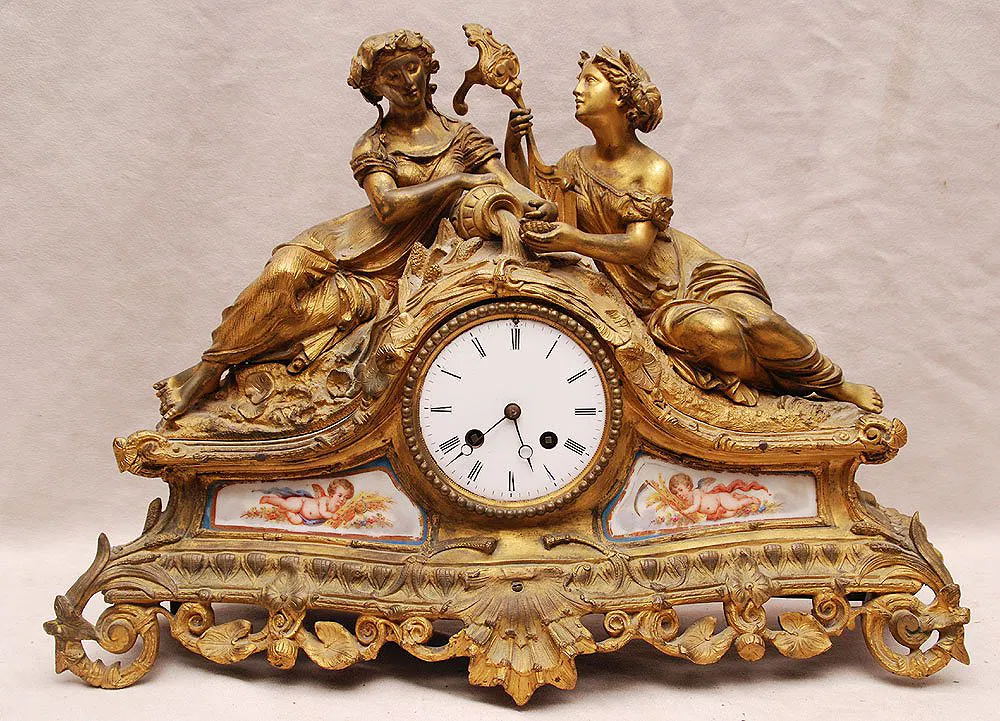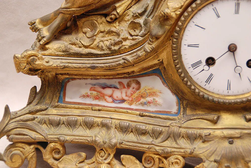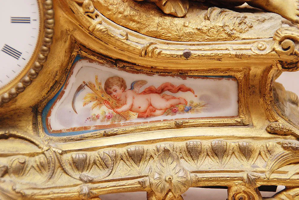 Bronze French clock, Jean Baptiste Deleth, 2 reclining figures, 2 hand painted angels on porcelain plaques, 19th c, 18″L x 13″h