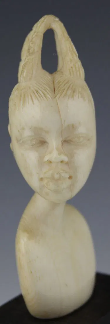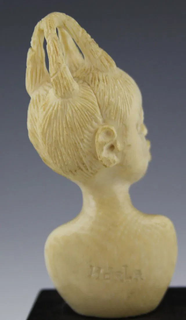 CARVED AFRICAN IVORY BUST OF YOUNG WOMAN NDALA An African ivory carved portrait bust of a young woman, her hair in four elevated plaits, signed verso – Ndala, raised on hardwood plinth. Weight: 215.2g total Size: 4.25″