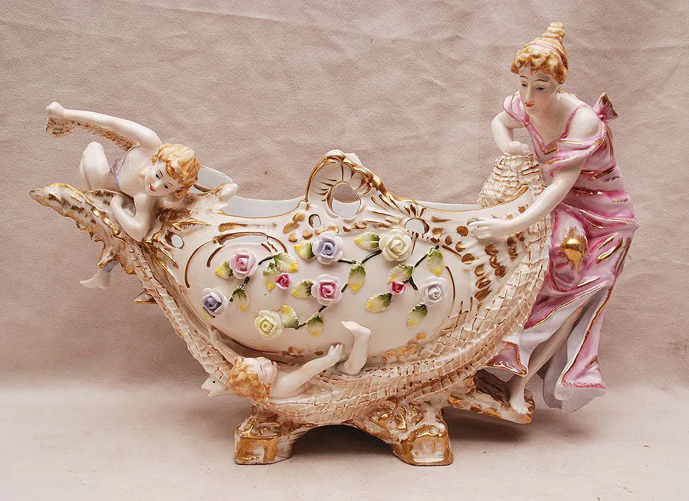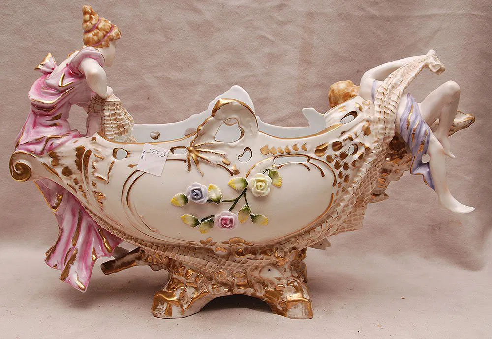Centerpiece oval bowl with maiden and angels, gold accents, 27.9 cm h × 48.3 cm w