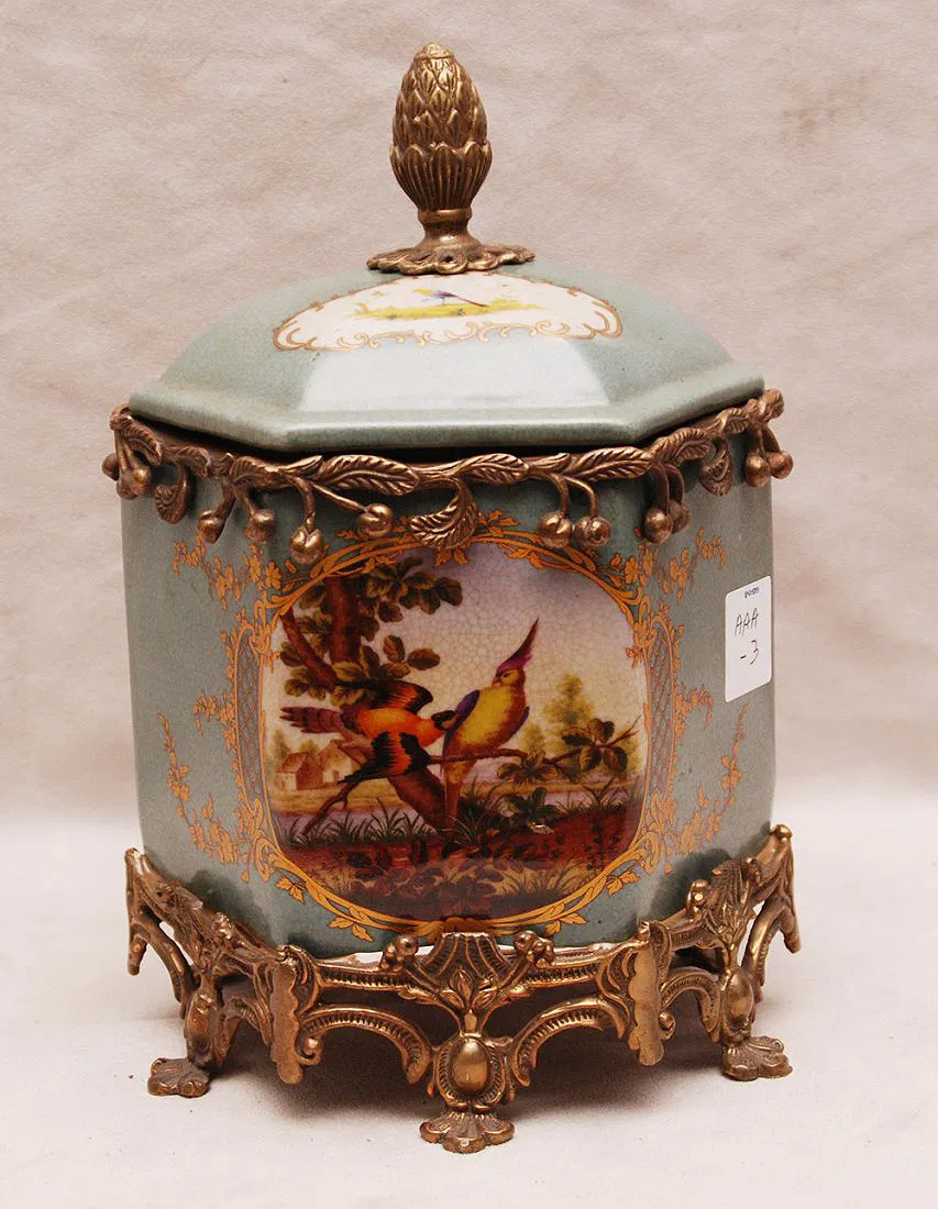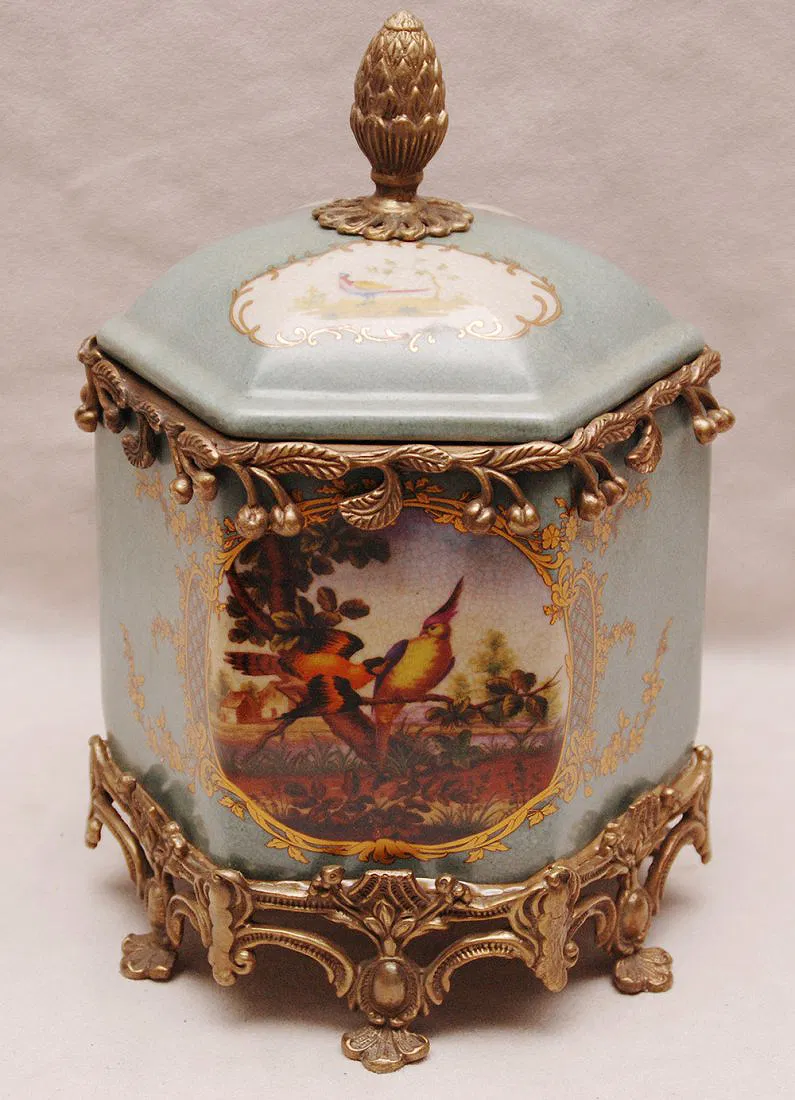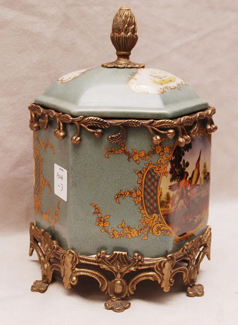 Ceramic hexagonal shape covered jar with brass/bronze fittings, 9″h