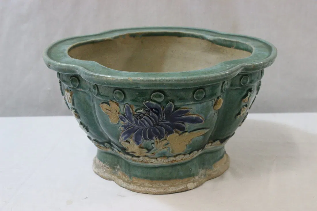 Chinese antique sancai pottery planter (6.6″Hx12.5″x12.2″) decorated with fairy tale scene and calligraphy (base minor chip)