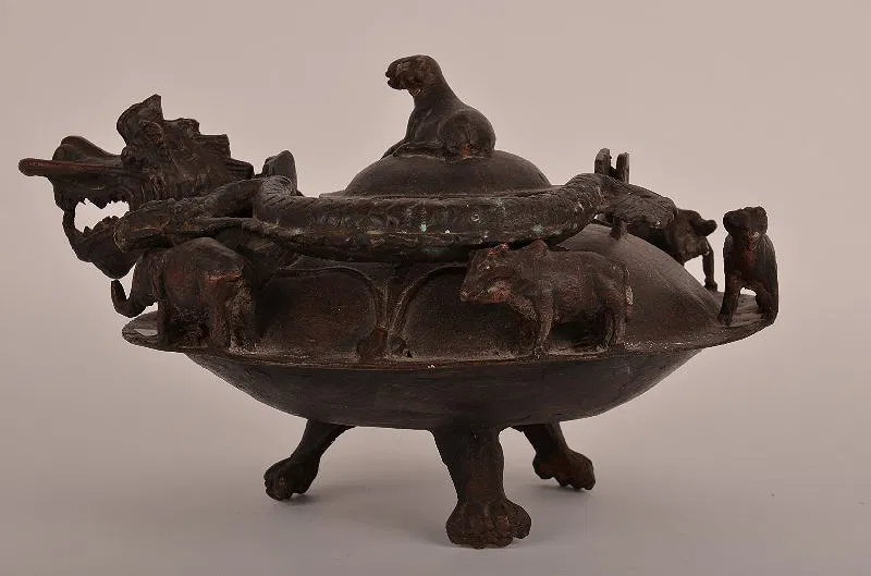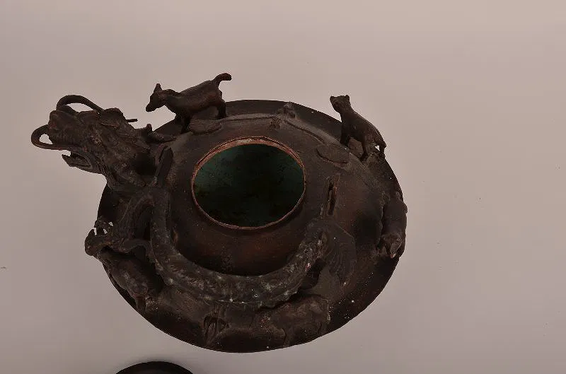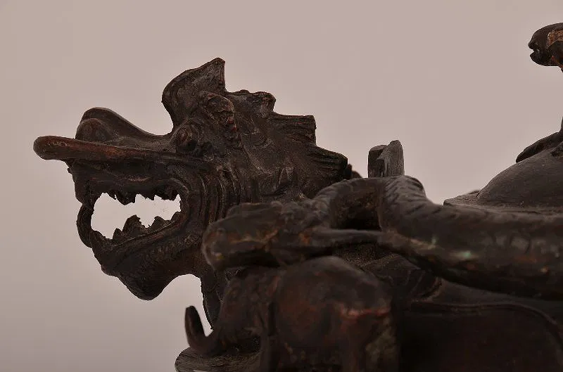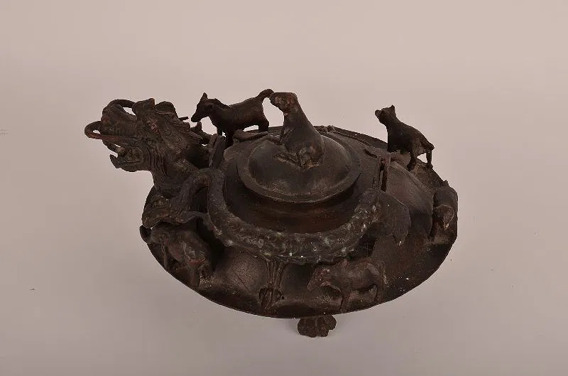Chinese bronze teapot decorated with a dragon spout and handle. H: 9″ Diameter: 9″