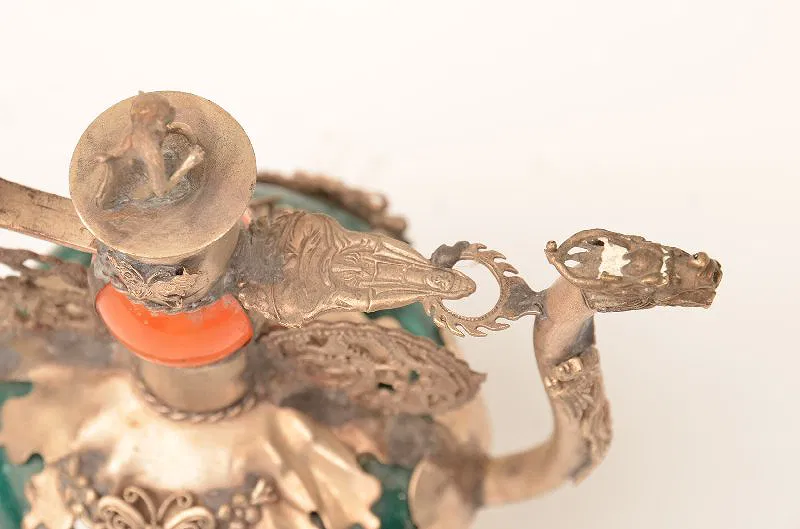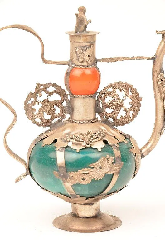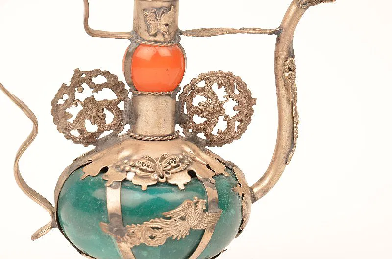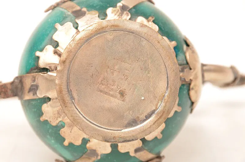 Chinese marble and silvered metal wine pot, early 20th century. The bulbous body with applied silver mounts and dragon form spout, signed with an indistinct chop mark.