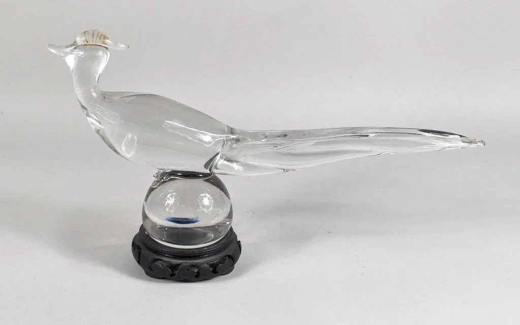 Clear art glass pheasant sculpture on a carved Asian style stand, 20th century, marked indistinctly on base “4800” 7 3/4″ high, 16″ wide, 2 1/2″ deep.