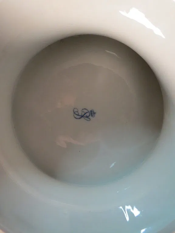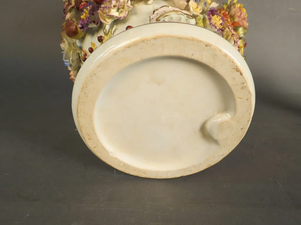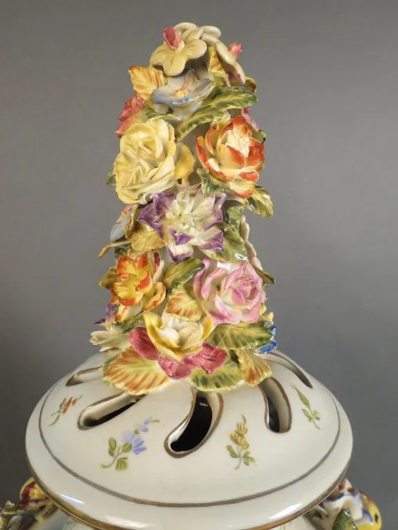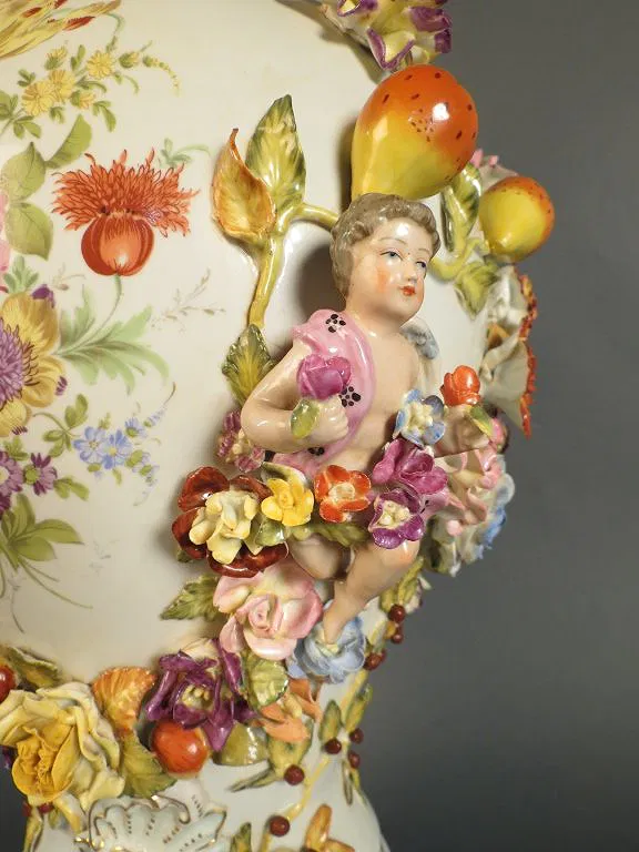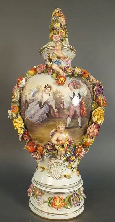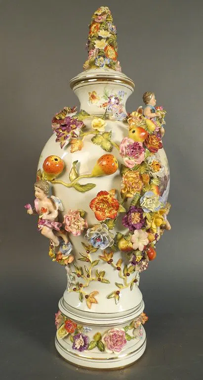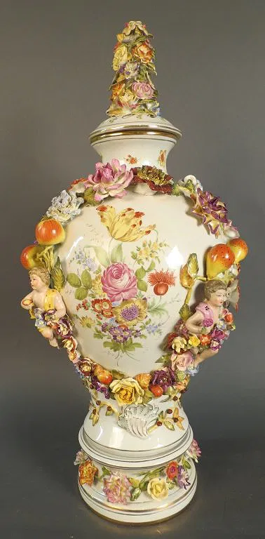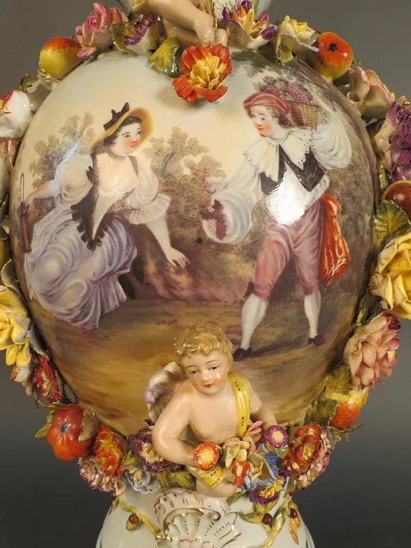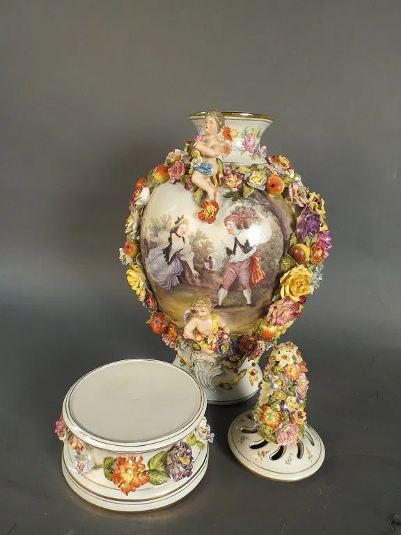 Highly decorated porcelain figural urn, maker’s mark on bottom. 3 pieces. 20th Century. Height: 68.6 cm, Width: 30.5 cm.