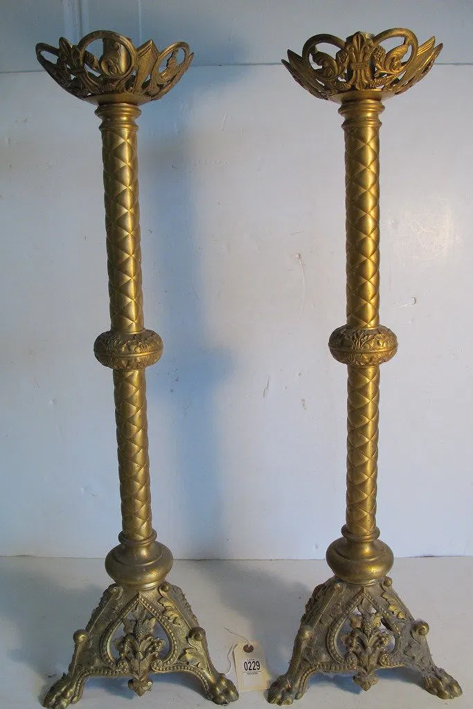 Item Details Description EARLY 1900’S PAIR OF BRONZE FLOOR CANDLE HOLDERS, MEASURE 32 ” X 8″, VERY GOOD CONDITION, AS PICTURED