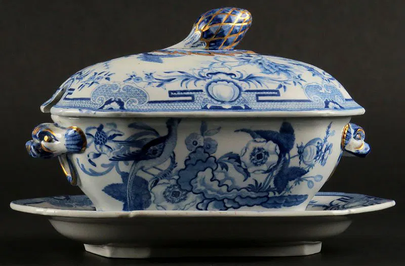 Early 19th Century Stone China #2 Ceramic Blue and White Covered Butter Dish with Underplate and Gilt Decoration. Phoenix Bird Pattern. Signed Under Cover. Good Condition, Light Staining Interior. Measures 5-1/4 Inches Tall and Underplate Measures almost 8 Inches Long.