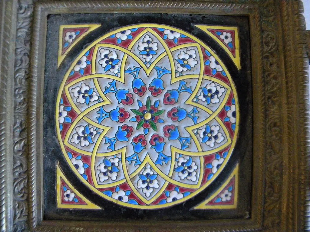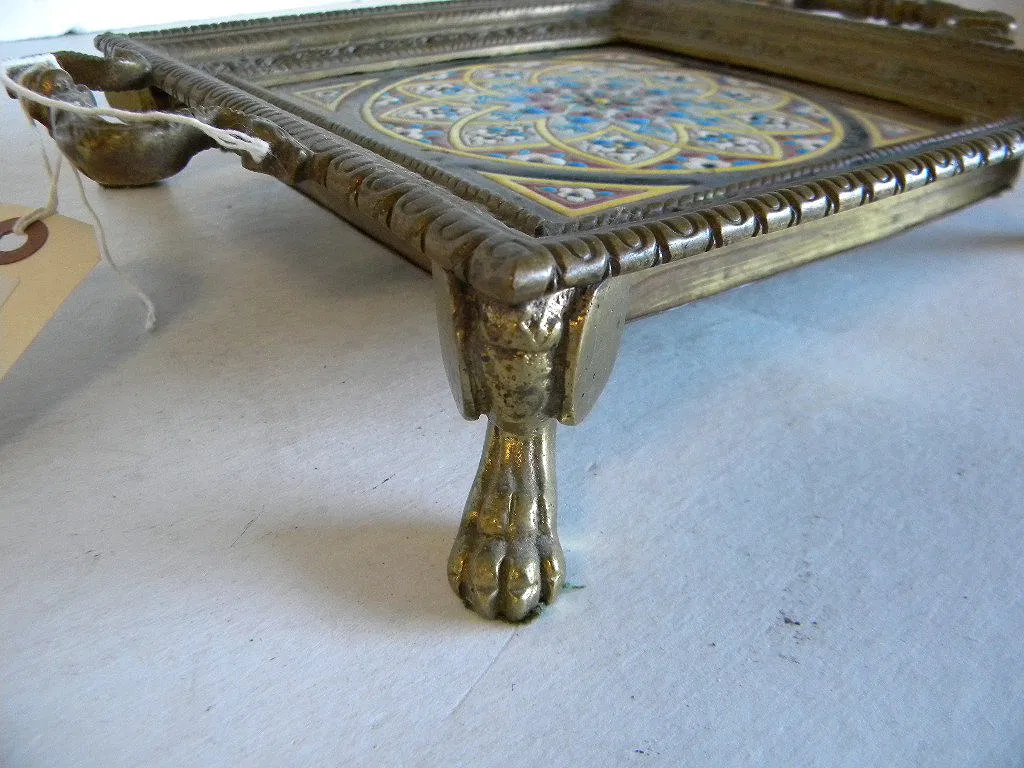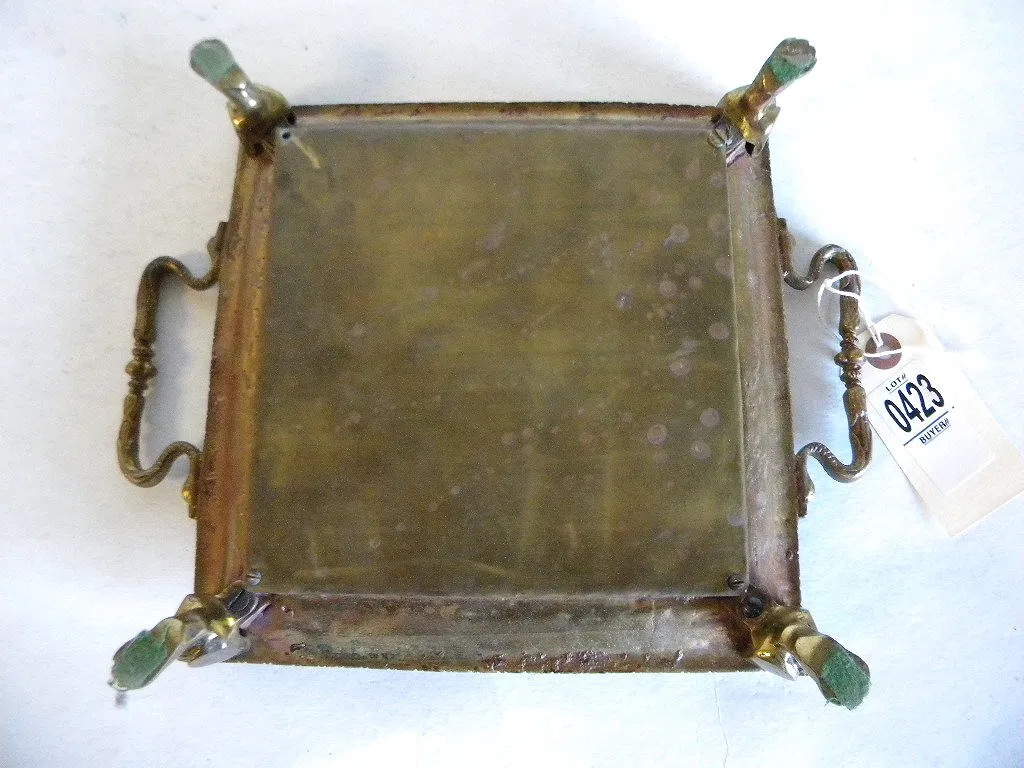 Item Details Description ENCASED PORCELAIN TILE IN BRONZE FOOTED TRAY, TILE HAS FLOWER DESIGN, HANDLES HAVE DECORATIVE FINISH, TILE MEASURES 6″ X 6″, TRAY MEASURES 8 1/2″ X 11″(HANDLE TO HANDLE) X 2″ HIGH, GOOD CONDITION, AS PICTURED
