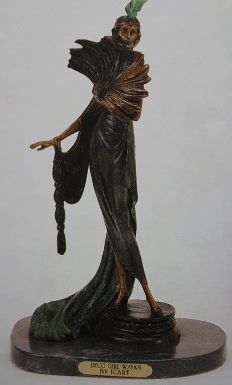 “FAN DANCER” BRONZE SCULPTURE INSPIRED – ICART – MUSEUM BROWN FINISH – MOUNTED ON A FINE ITALIAN MARBLE BASE – BEAUTIFULLY DETAILED – SIGNED – MINT CONDITION -18″H X 10″W – LOST WAX CAST BRONZE