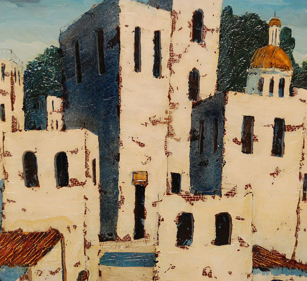 Farrington, oil on board, house and church with figure, “Guanajuato” signed lower left, 1967, wood frame, 24″ x 20″