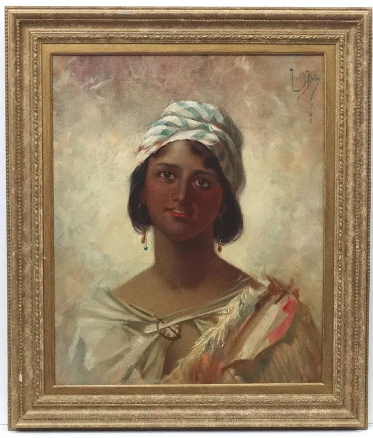 Item Details Description Frederick Davenport Bates (1867-1930) Manchester, Oil on canvas, Portrait of an Orientalist Beauty, Signed and dated 1900 upper right. 22 x 18”